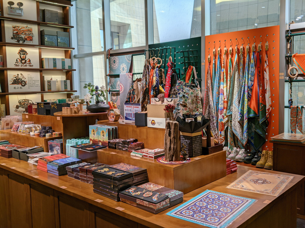 敦煌文创产品也散布于空间之内,从冰箱贴、书签、流沙瓶到丝巾、饰品、盲盒,虽然价格稍高,但品相精致。