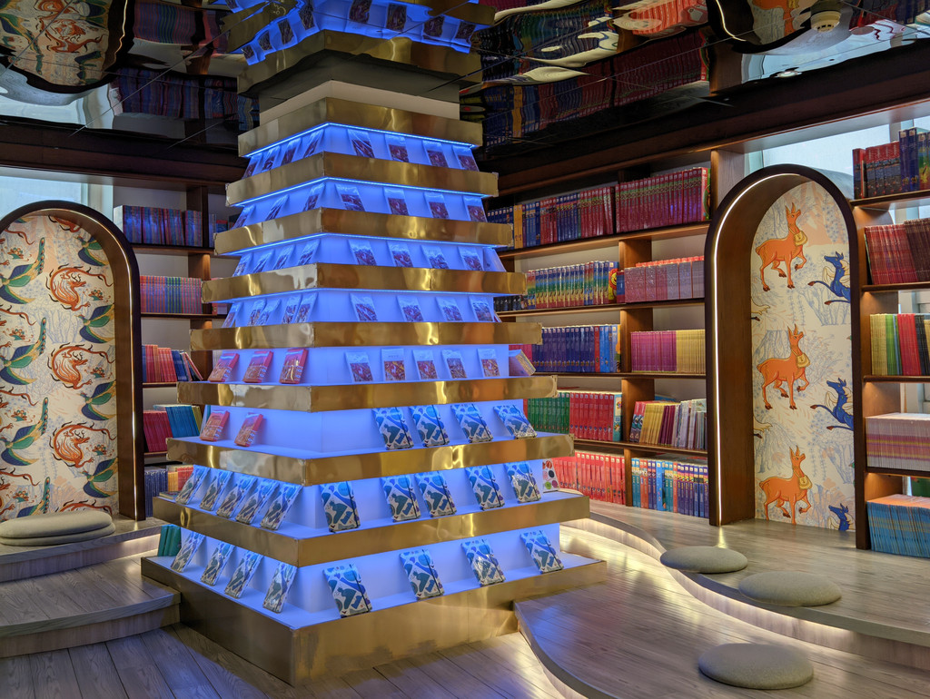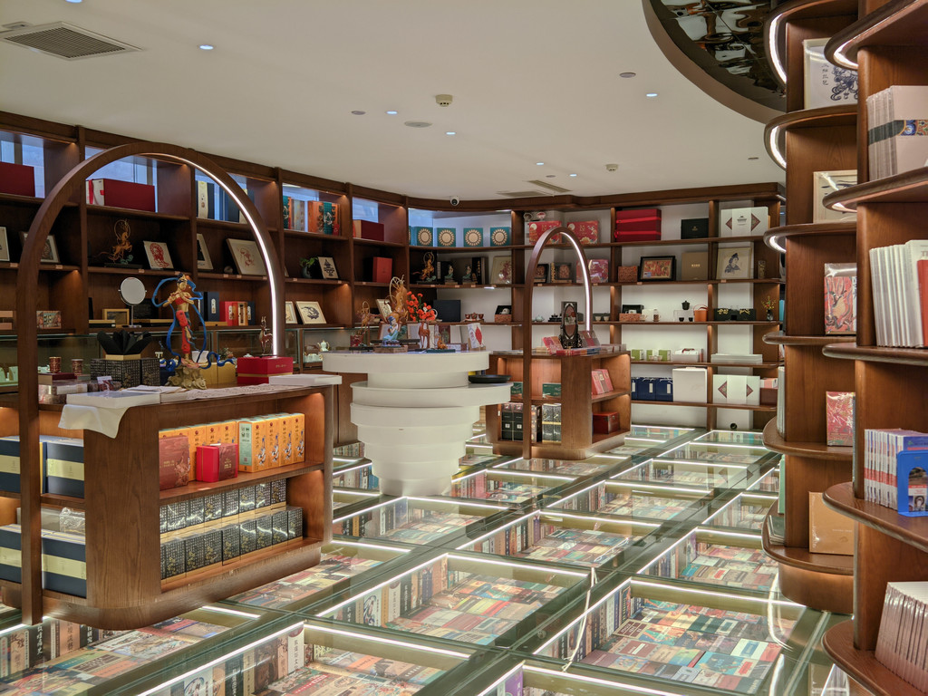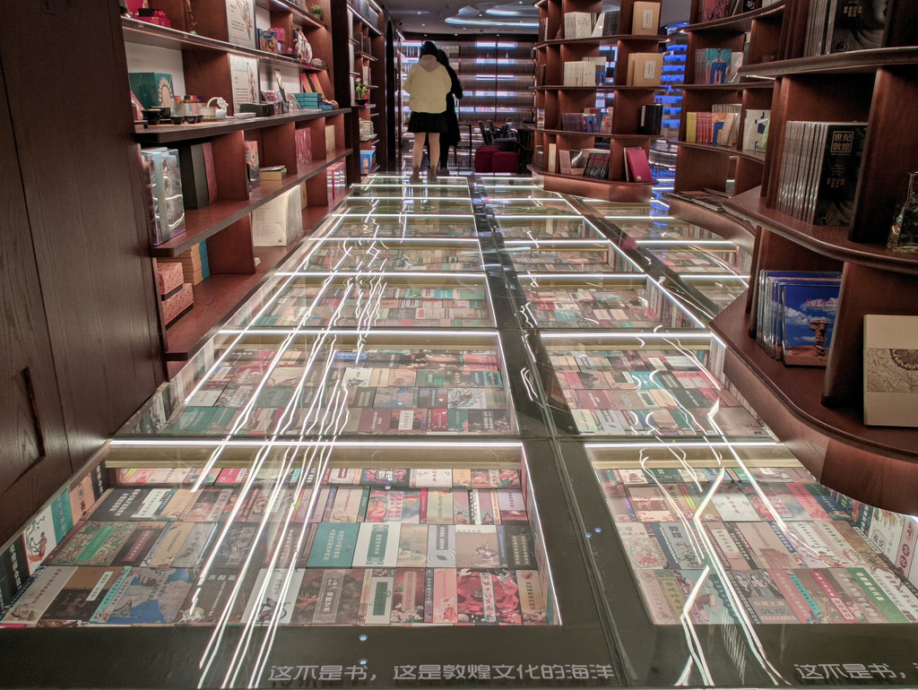 二楼还设有一处藏经阁,专门陈列了数种敦煌遗书,其中包括被誉为书局“镇局之宝”的《敦煌遗书·律藏初分》典藏版。书局的设计独具匠心,随处可见洞窟元素的拱门。二楼的玻璃地面下铺满了敦煌主题读物,令人眼前一亮。