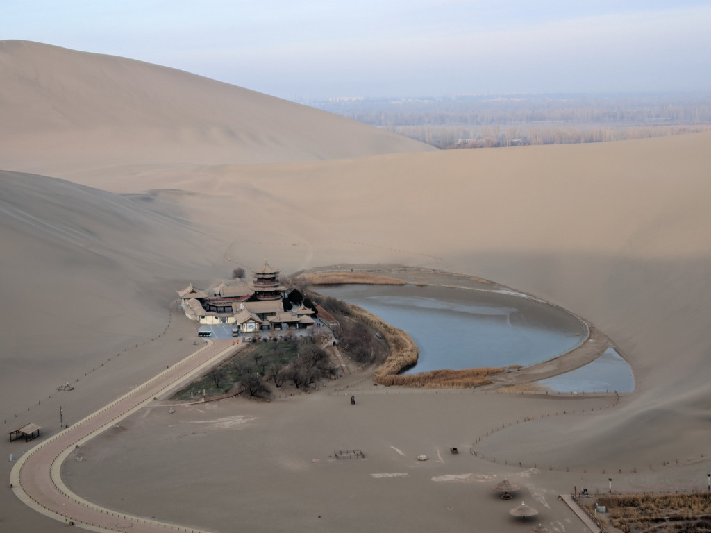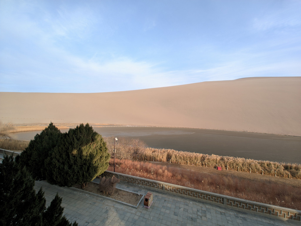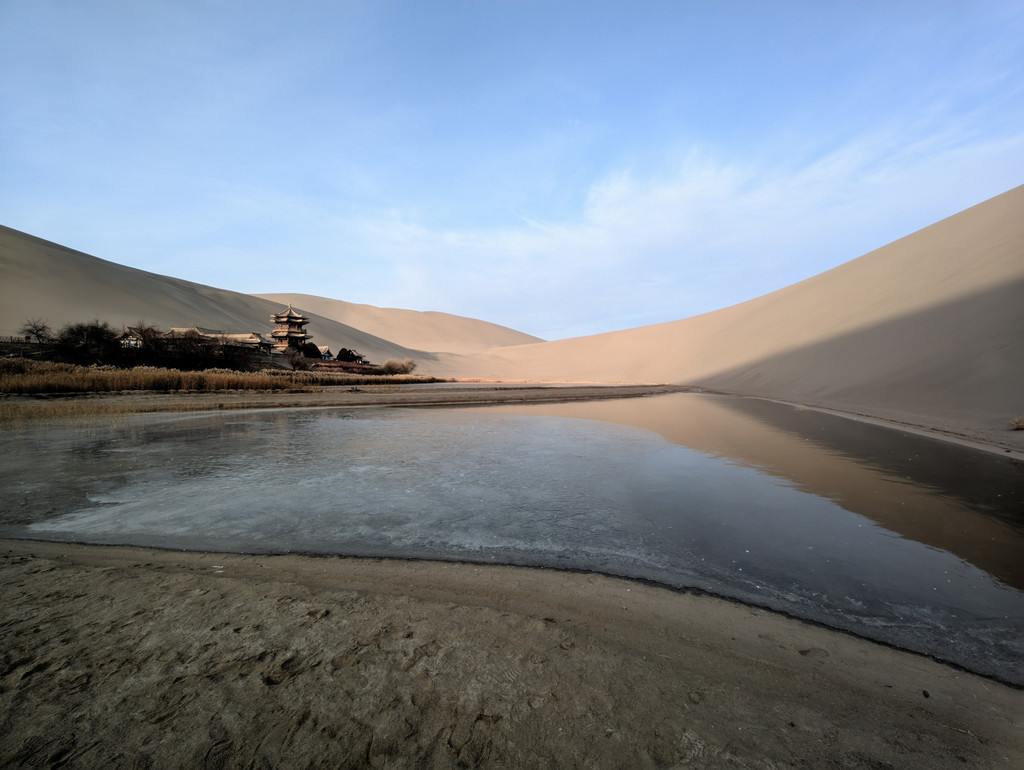 下山后在月牙泉边转了一圈,月牙泉已经结冰,偷偷站上泉面一会,好像也很安全。冰下还有鱼儿在游动,很典型的北方景象。