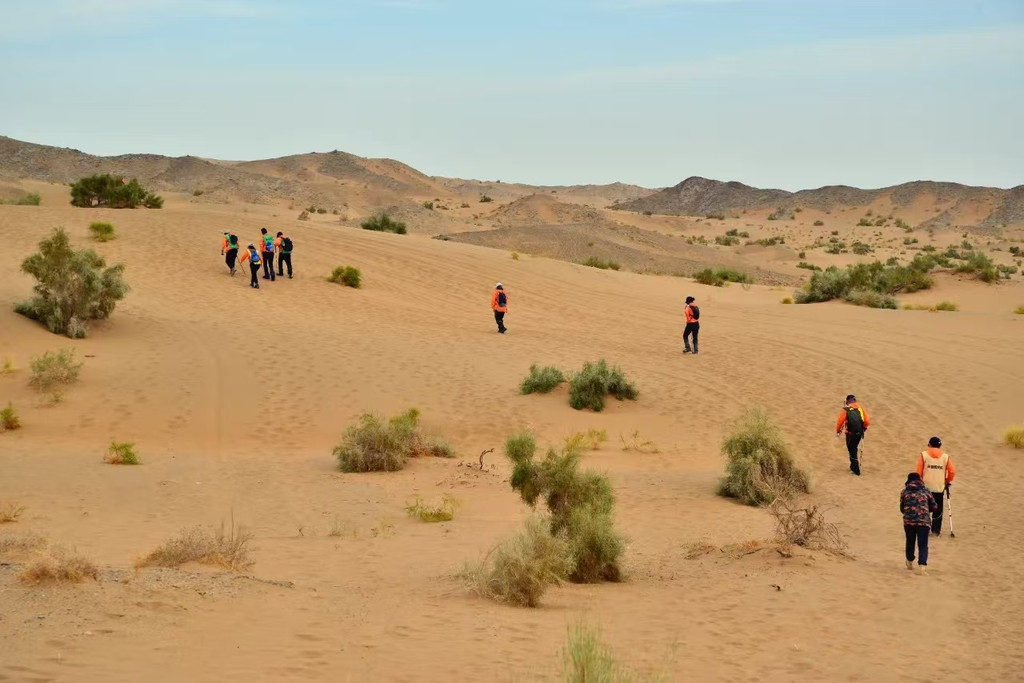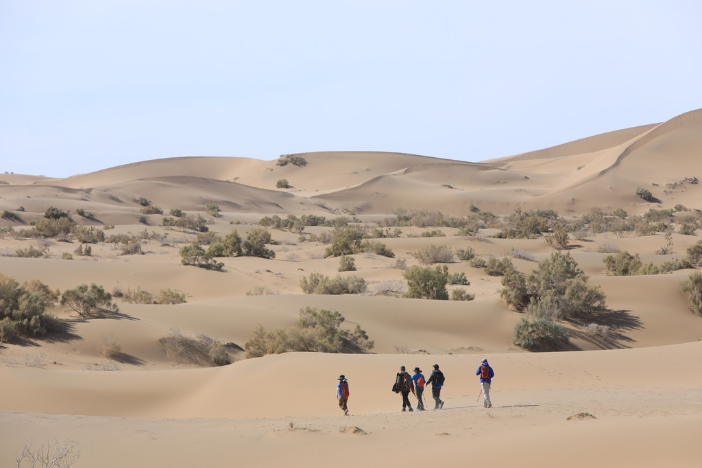 沙漠里徒步,一切都有一种野生感。不管是遒劲的风,还是劲吹的草,哪怕是柔和的沙丘线条看上去也干脆利落。一切都告诉我们,这里不是娱乐休闲的温室,而是残酷真实的自然。