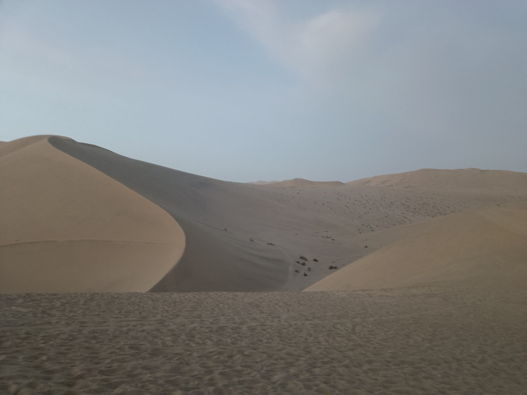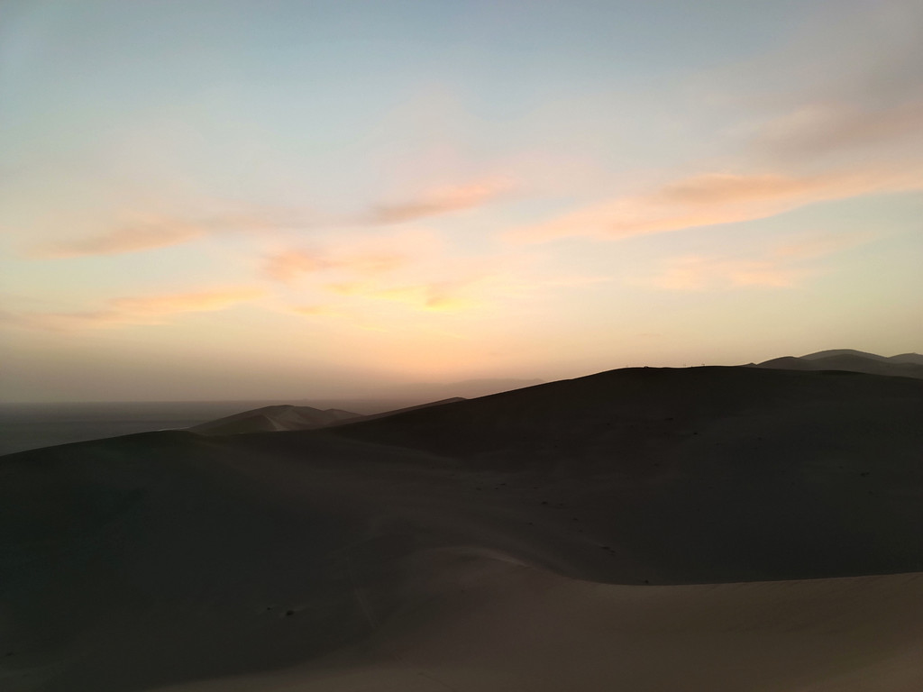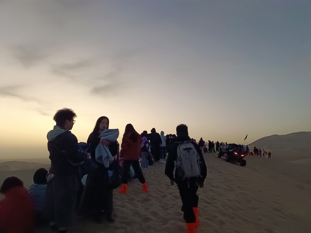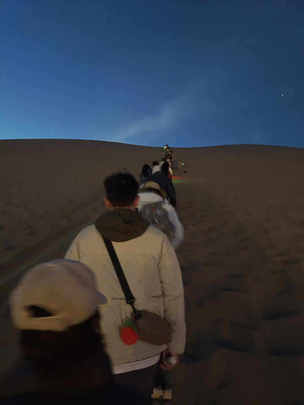 好不容易赶在日出开始前赶到了最佳位置,这里已经等了不少人了。敦煌早晚温差很大,早上的沙山凉冰冰的,大家都在寒风中等着。