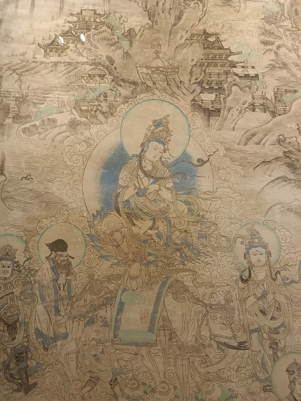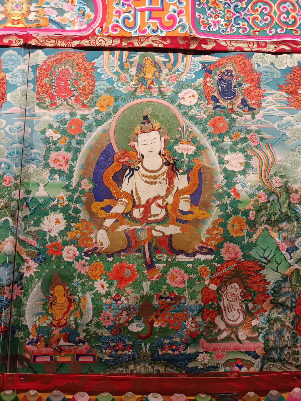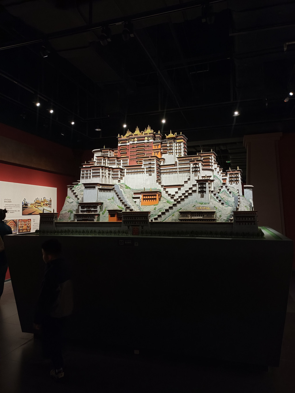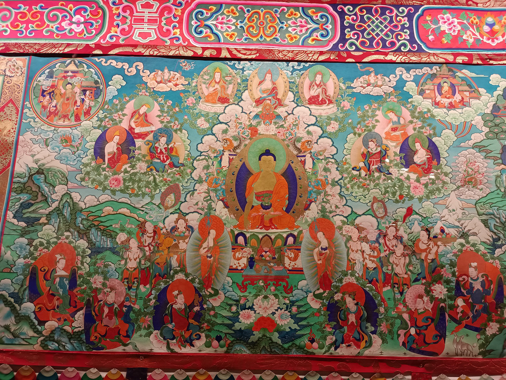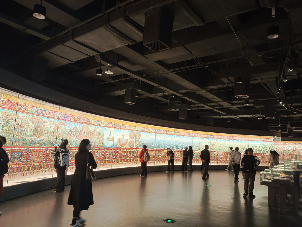 这个博物馆四楼展出了一幅六百多米的超长的唐卡,绘制了各种藏传佛教的人物、生活场景等,一边走一边看走了十几分钟,在整个展厅弯弯绕绕的展出。