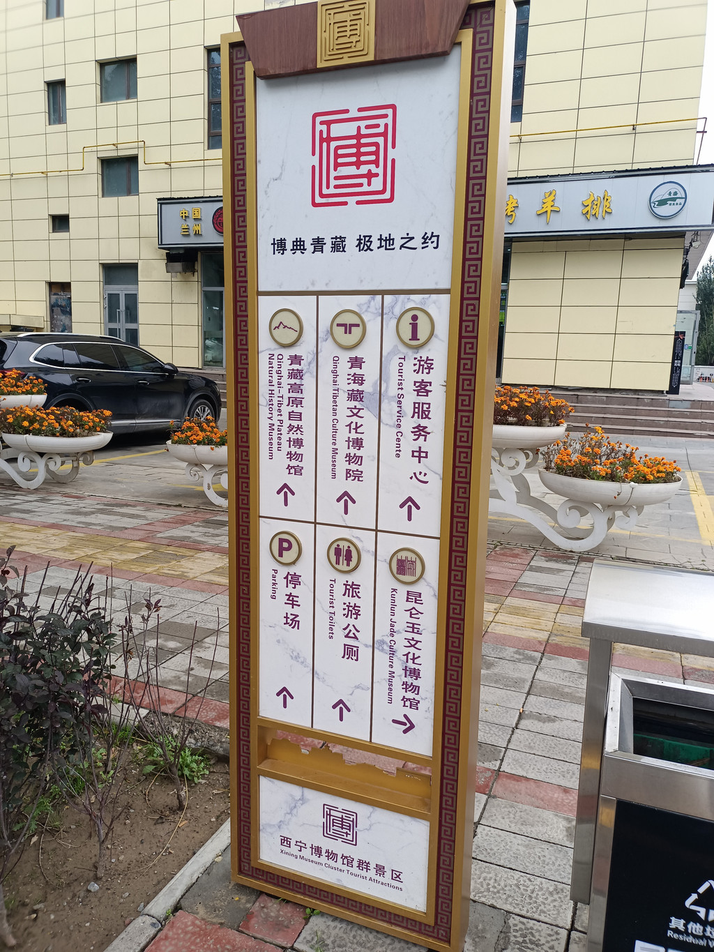 到酒店放下行李,出门去青藏高原博物馆,天下起了蒙蒙小雨。坐了将近一小时公交车,下车之后看到了指示牌。