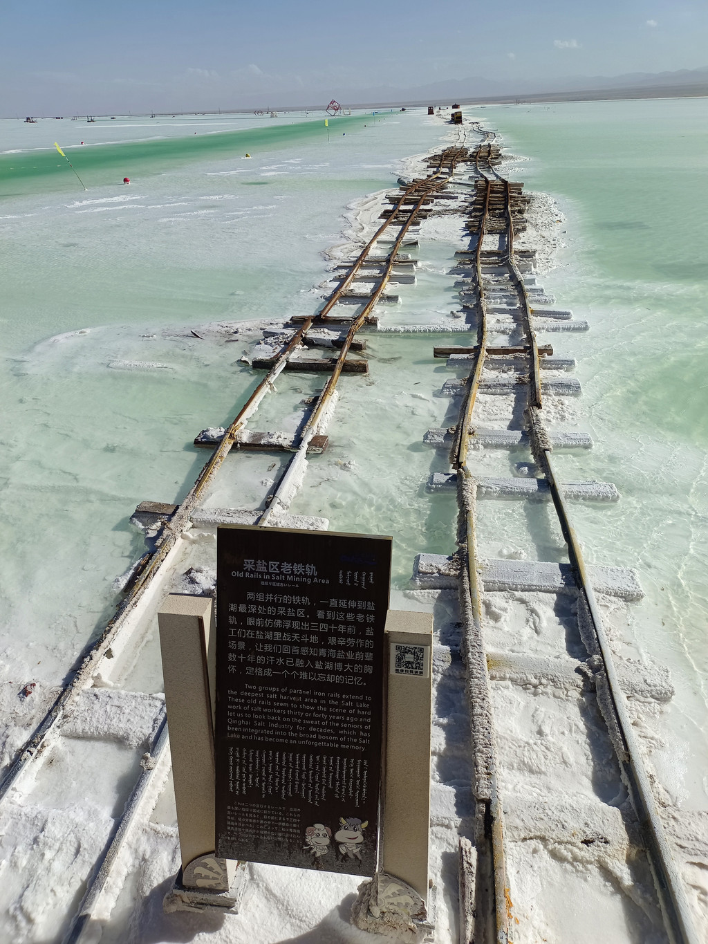采盐区老铁轨,茶卡小火车就是原来的老铁轨改建的,现在的采盐区在另一边。导游说茶卡盐湖的盐,全国人民吃800年都吃不完,真是宝藏盐湖了。我尝了一下湖水,确实是又咸又涩。