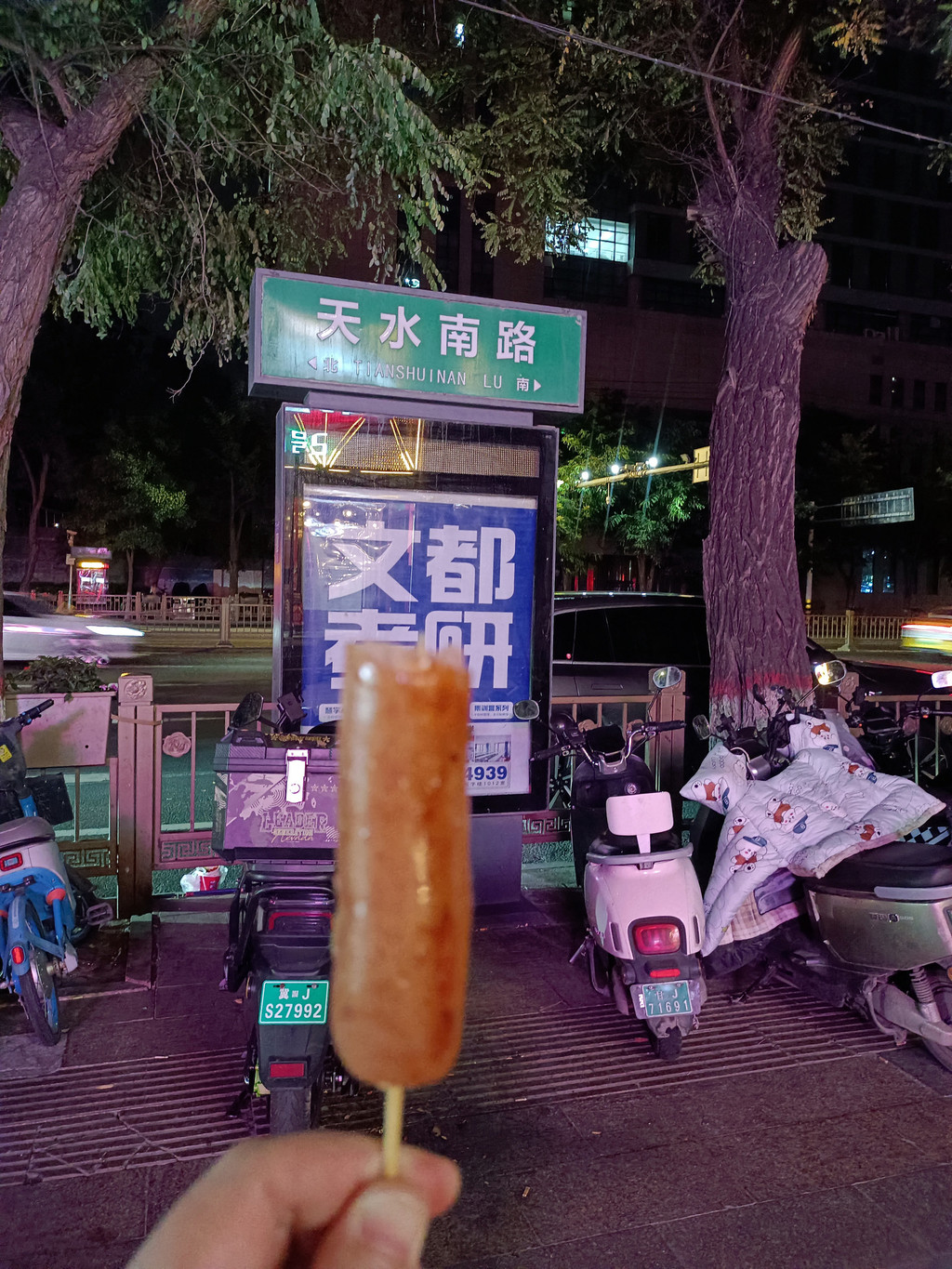 下了车已经快凌晨两点了,路边买了根烤肠。