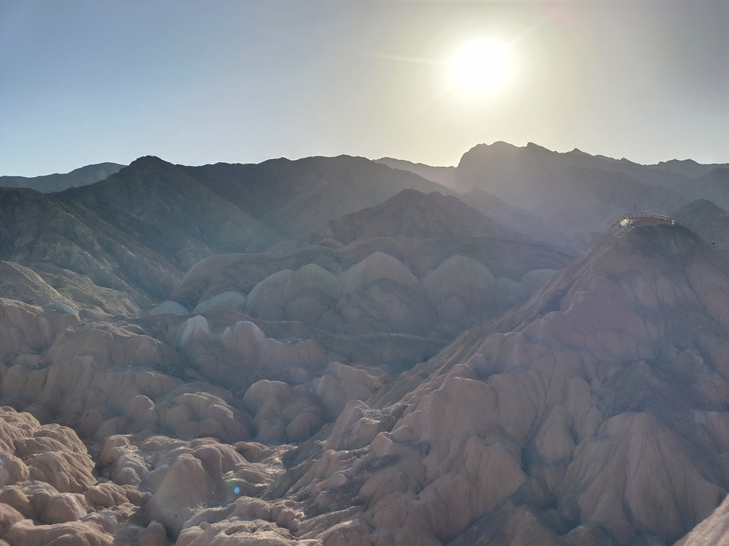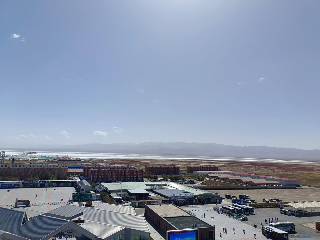 到达茶卡盐湖,一下车,终于知道这里为啥能形成盐湖了,又晒、风又大,太阳照的人睁不开眼,风大的走不动路,景区门口有个观景台,先去观景台看看全景。