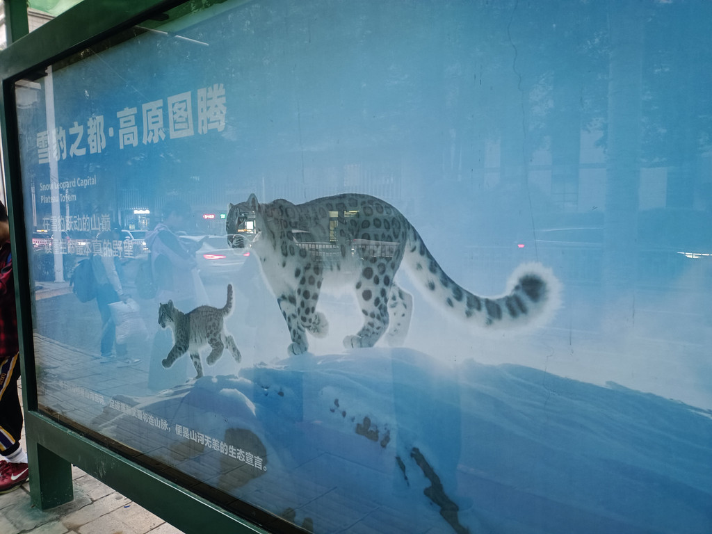 离开青海省博物馆,准备去夜市逛逛,公交站盘也画着雪豹。旁边的小朋友还在讨论前一天出逃的雪豹“闹闹”,没想到离热搜事件这么近。