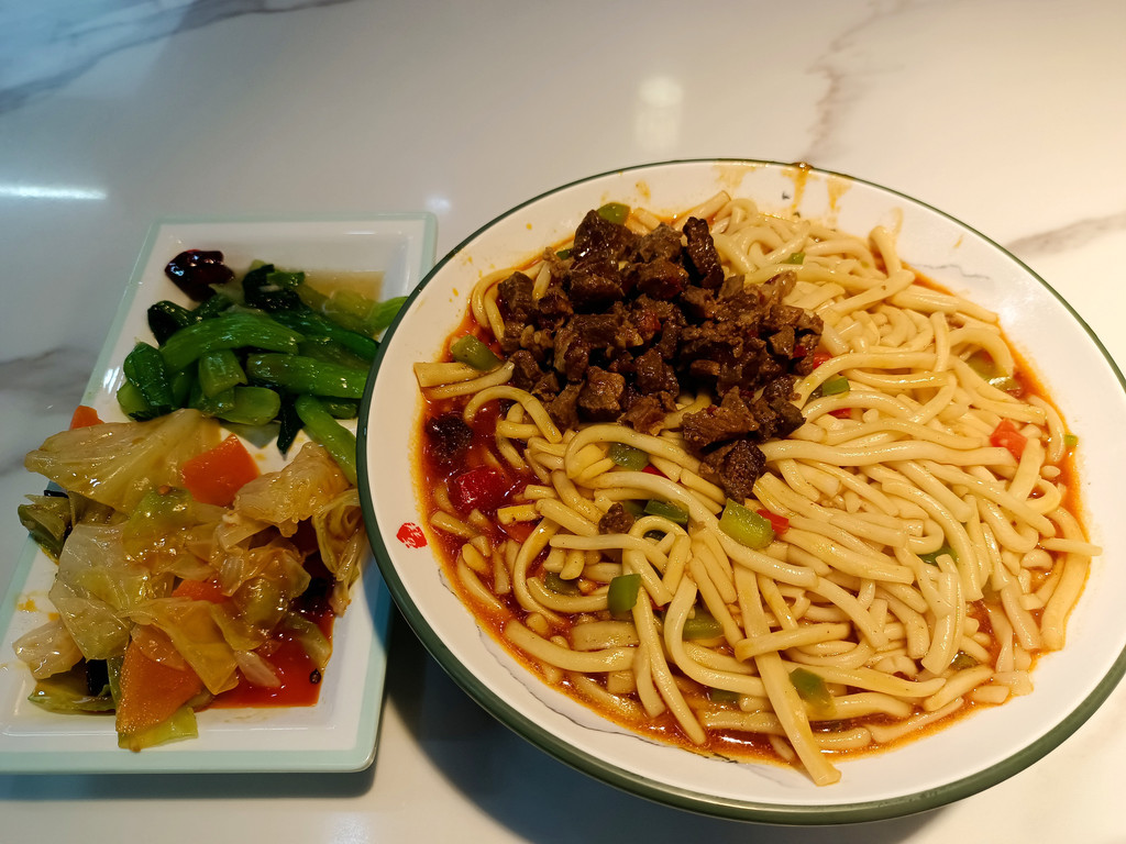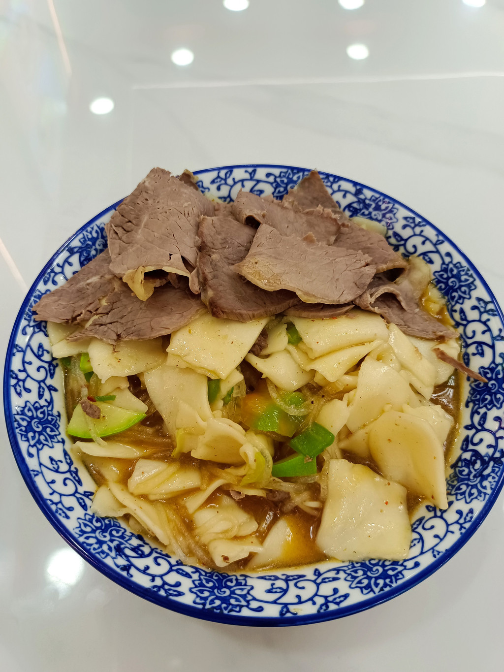 一上午的时间基本都在路上,先是地铁,再动车,再公交车,到目的地已经快一点了,于是先吃了个午饭,随机选了一家炒面片,竟然意外的好吃。虽然是“炒”面片,但介于汤面和炒面之间,有一点点汤裹着面皮,非常好吃。还放了点粉丝,配菜是西葫芦和西红柿,放一点辣椒,酸酸辣辣。