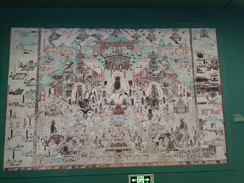 敦煌艺术馆里展出的壁画,比实地去到莫高窟看到的还要多,内容讲解也更全面。因为莫高窟很多洞窟是不对外开放的,而这里展出的都是精华,只不过是复制品。