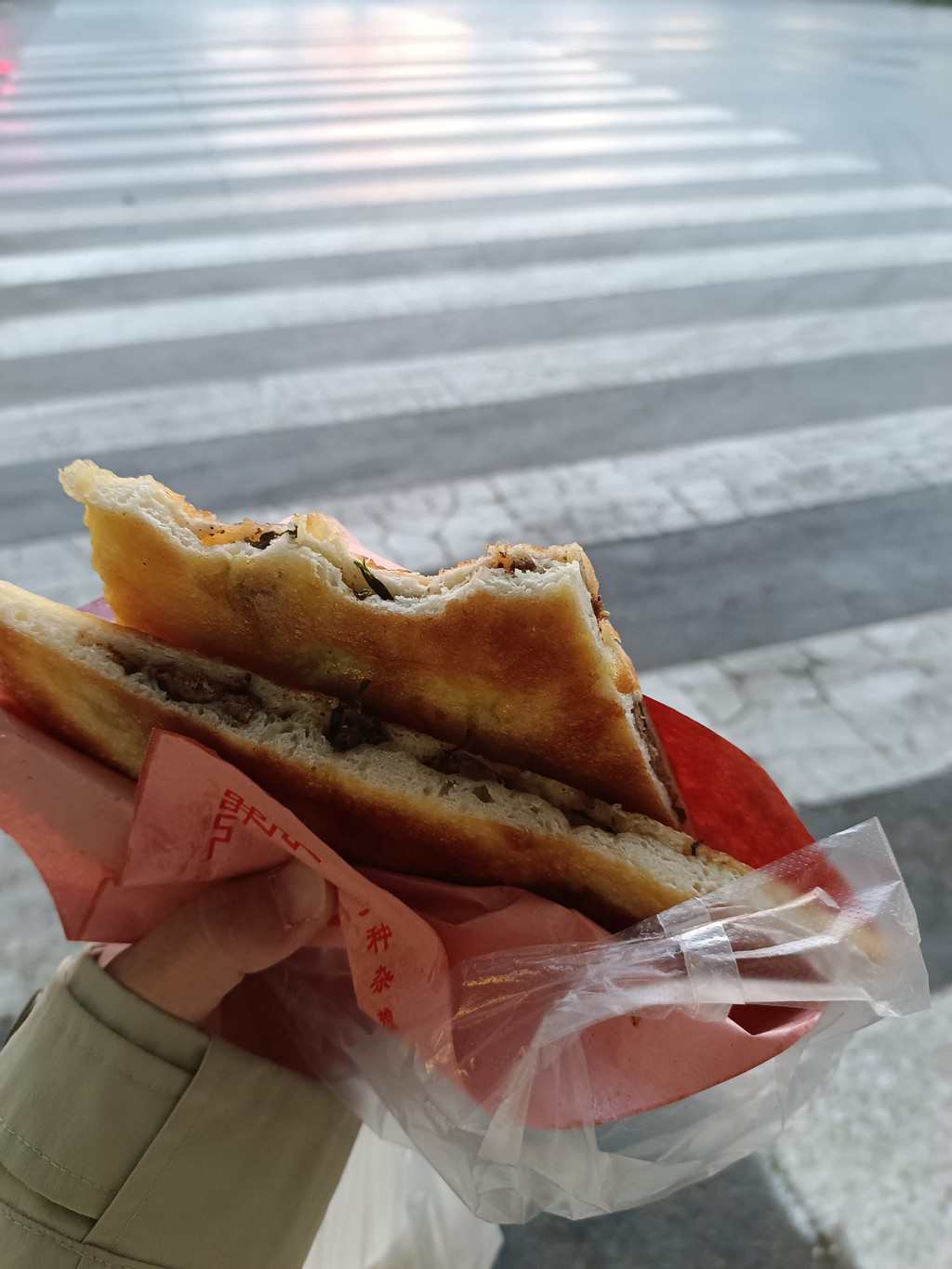 逛完盐站,就出景区了,在景区门口买了一个肉夹馍,是牛肉洋葱馅儿的,第一次吃这种肉夹馍。