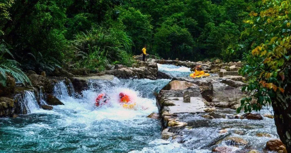 夹缝岩峡谷漂流带全长3.2公里,河道水流从上至下,从缓到急,河道蜿蜒绵长,可谓九曲十八弯,坐在皮划艇上起落水中,既可中流击浪、豪情飞扬,也可木桨横倚、静观风物,即惬意又刺激。