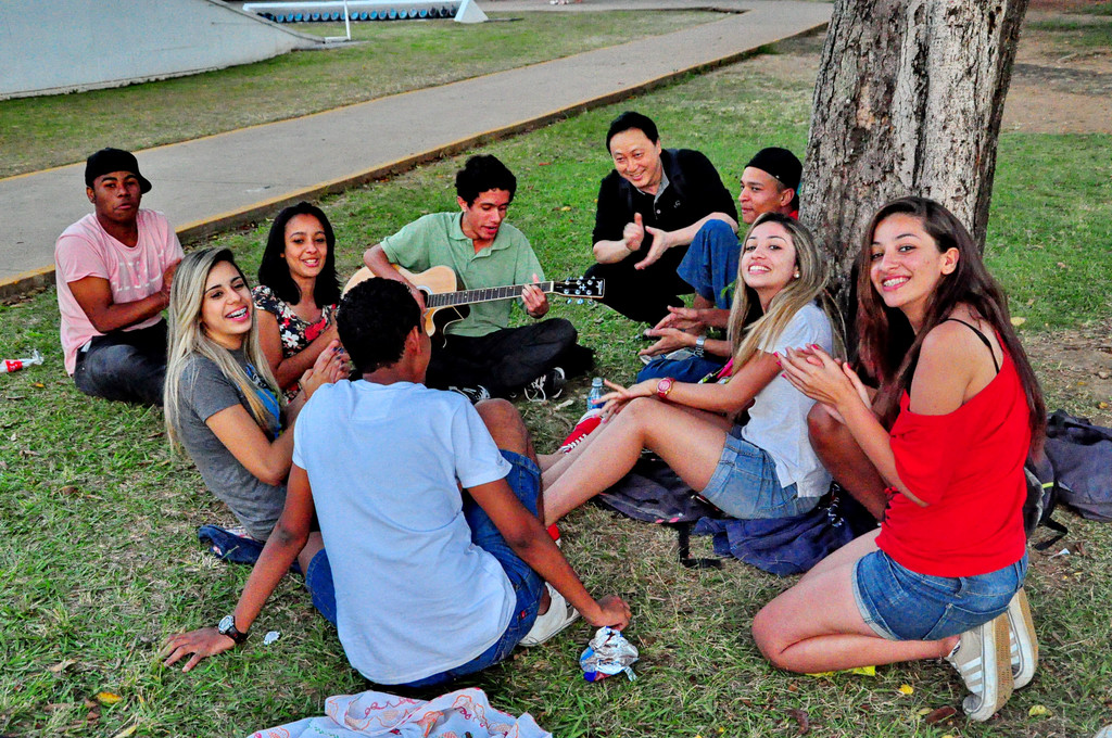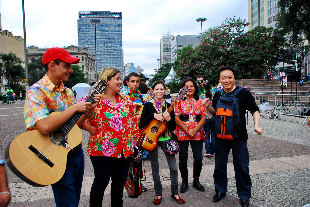 2013年4月,在巴西圣保罗街头,与欢庆的人群合影