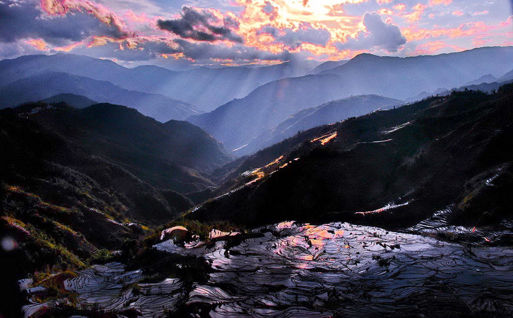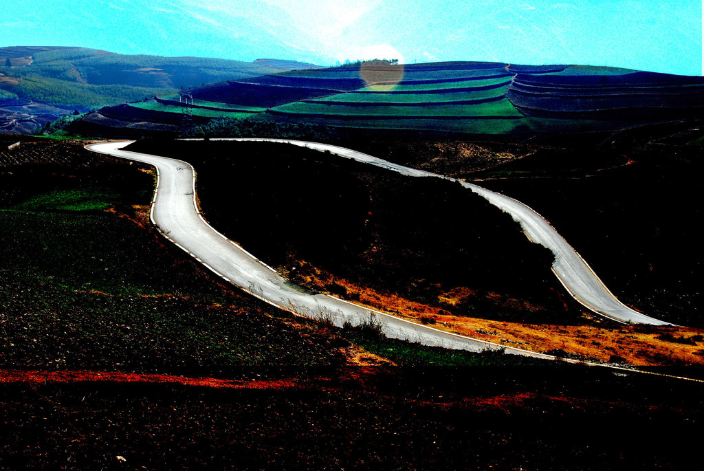 公路形成的光带。2013年春节,摄于云南东川红土地