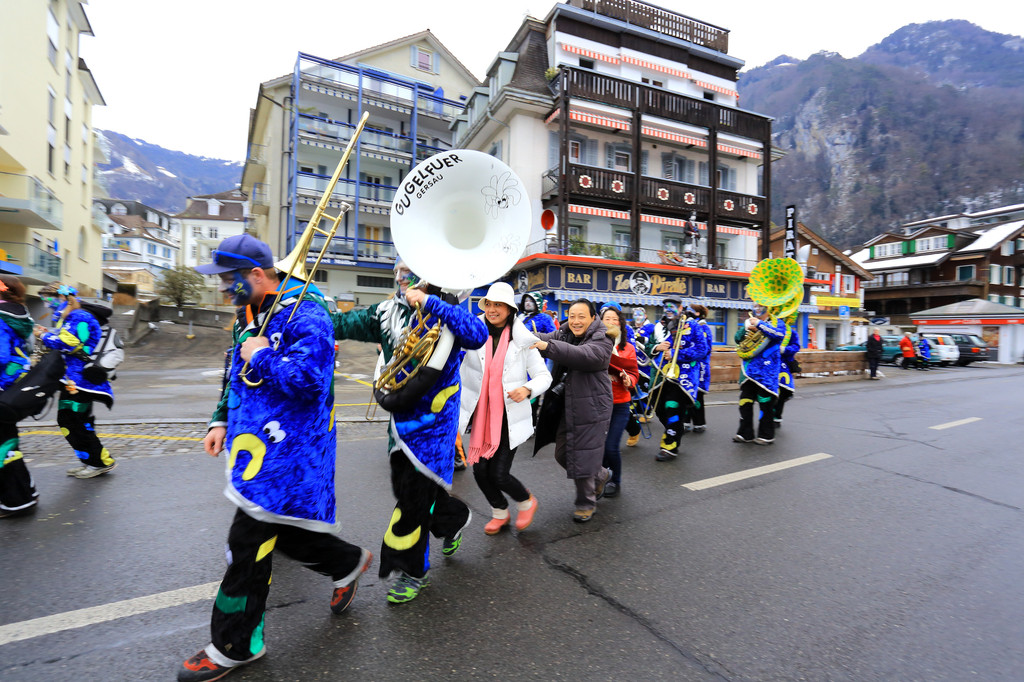 2017年春节,欧洲7国自驾。在去卢塞恩的路上,经过这个小镇,遇到一队庆典的队伍,敲锣打鼓,奏着欢快的乐曲,我们加入了其中,乐得其所: