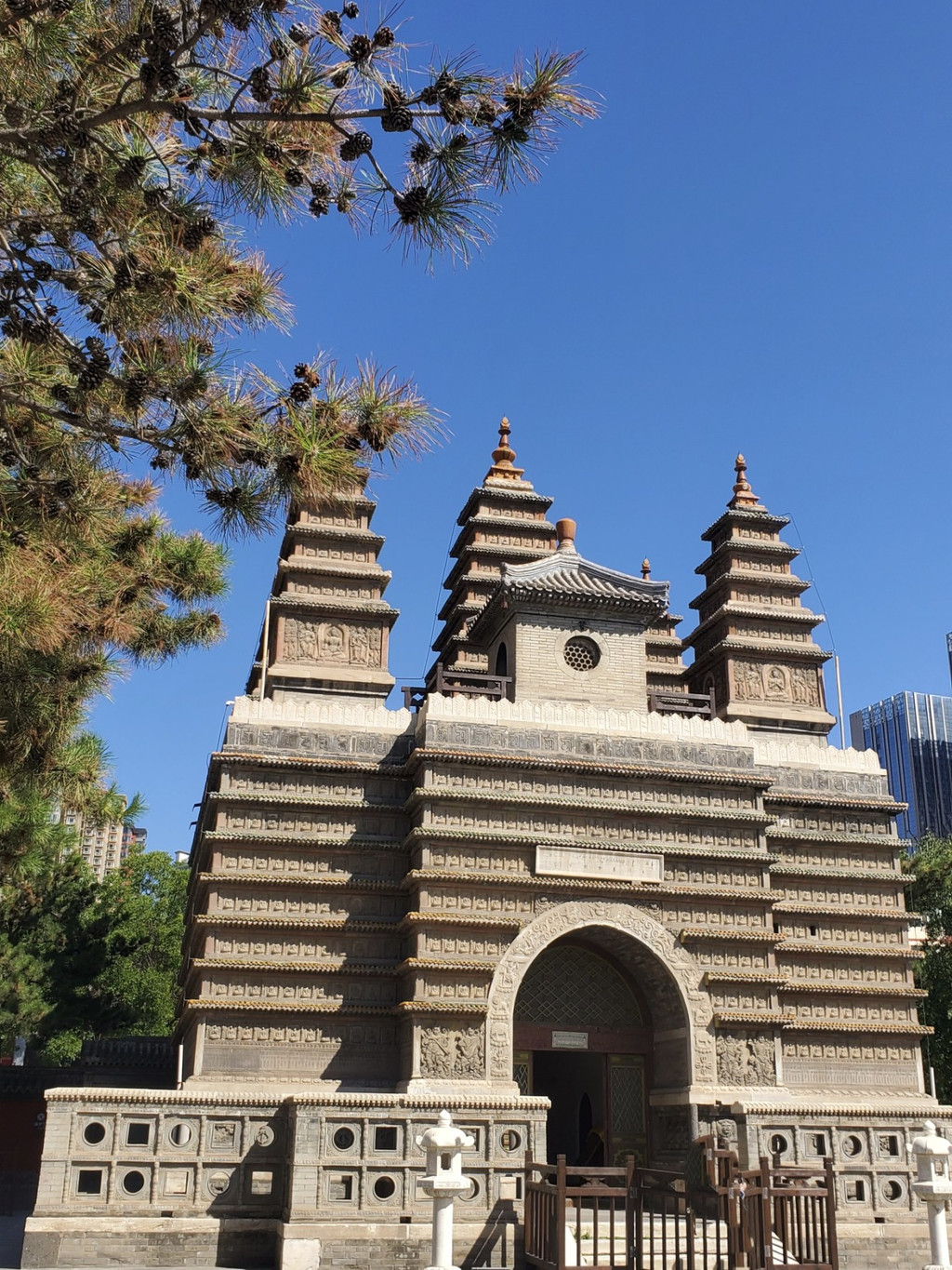 是一座磚制金剛寶座式塔,因塔頂有5座小塔,故也俗稱為「五塔」。該塔始建於清朝雍正年間,由塔座、塔身和五塔三個部分組成,通高16.5米。該塔下建有地宮,但具體情況不詳。