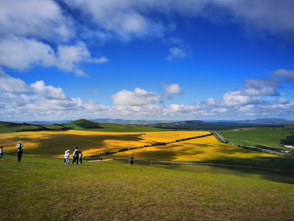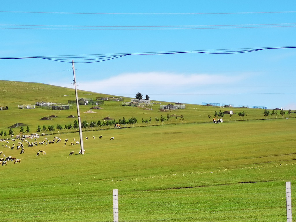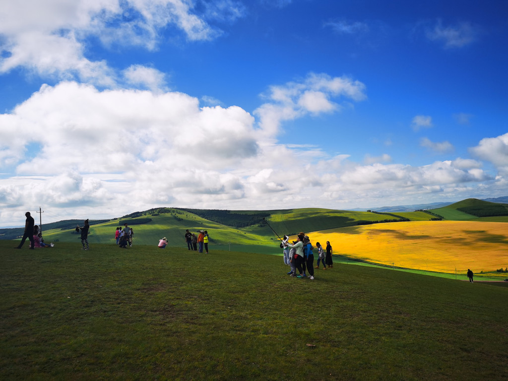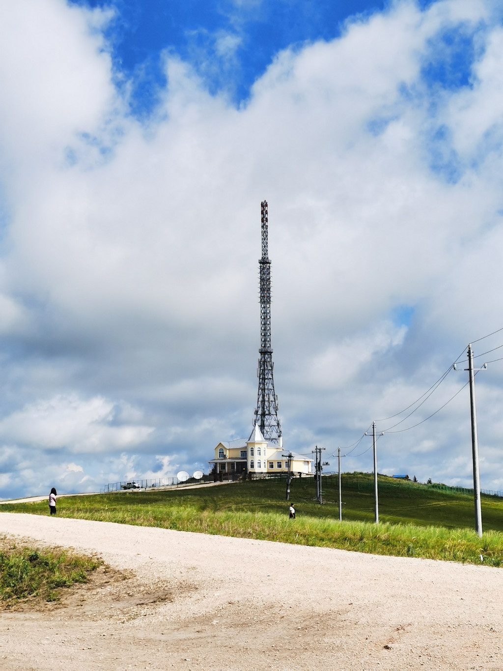 途中我们看到远处的高岗上有很多私家车,便也历经坎坷驱车前往,汽车在三分多钟的爬行后终于登上山顶。估计这处是供电站或者什么信号塔的接收处,地处草原这里的山包很高,于天空接的很近,远处金黄的麦田为翠绿的草原增添了靓丽的色彩。