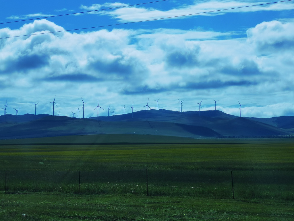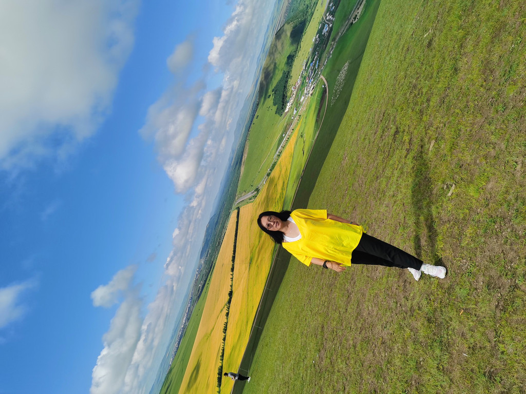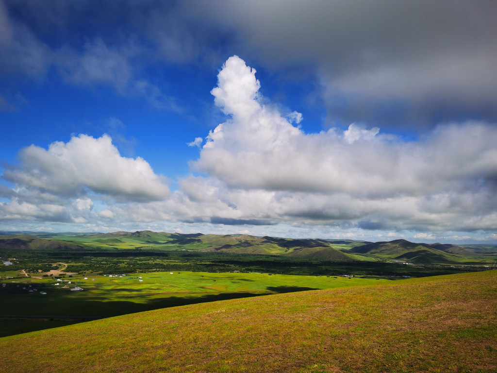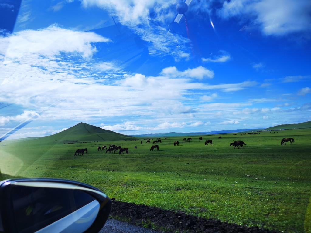 途中我们看到远处的高岗上有很多私家车,便也历经坎坷驱车前往,汽车在三分多钟的爬行后终于登上山顶。估计这处是供电站或者什么信号塔的接收处,地处草原这里的山包很高,于天空接的很近,远处金黄的麦田为翠绿的草原增添了靓丽的色彩。