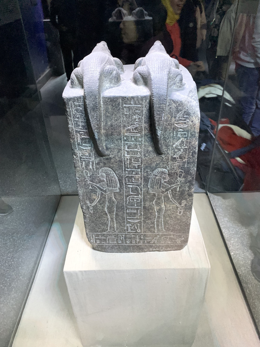 【女神Hathor的形象在石柱上方:一个长着牛耳的女人脸】