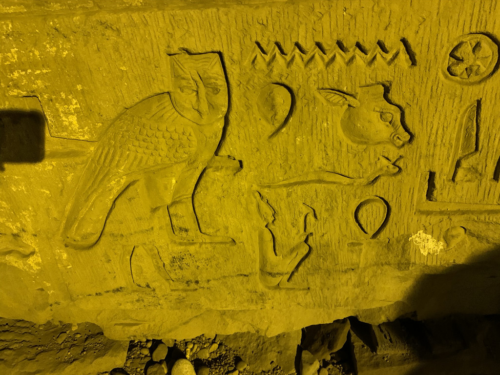 狭窄的走廊,两侧墙壁上刻画着荷鲁斯大战叔叔塞特替父洗冤的故事。