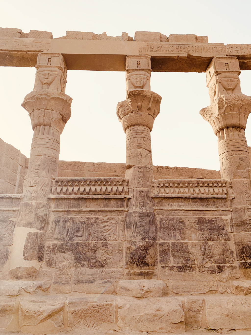 坐着小汽船,经过两岸的努比亚村庄和帆船,来到岛上。菲莱神庙是女神Isis的庙宇,上一篇写到古埃及人起誓会说”By Him who sleeps at Philae“,“他”是指大神Osiris,就是Isis的丈夫;而Elephantine以上的菲莱,据说就是Osiris的秘密安葬地。
