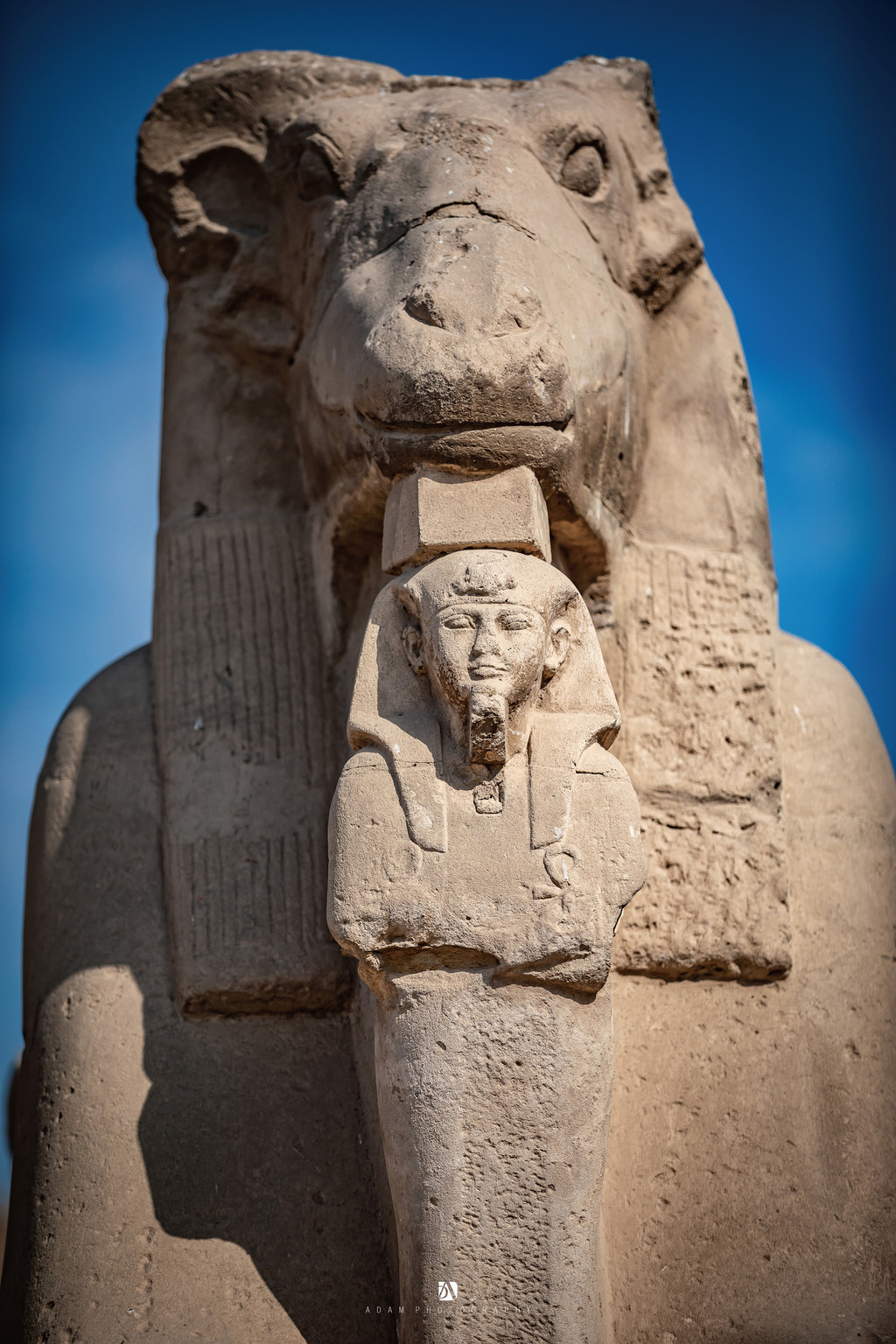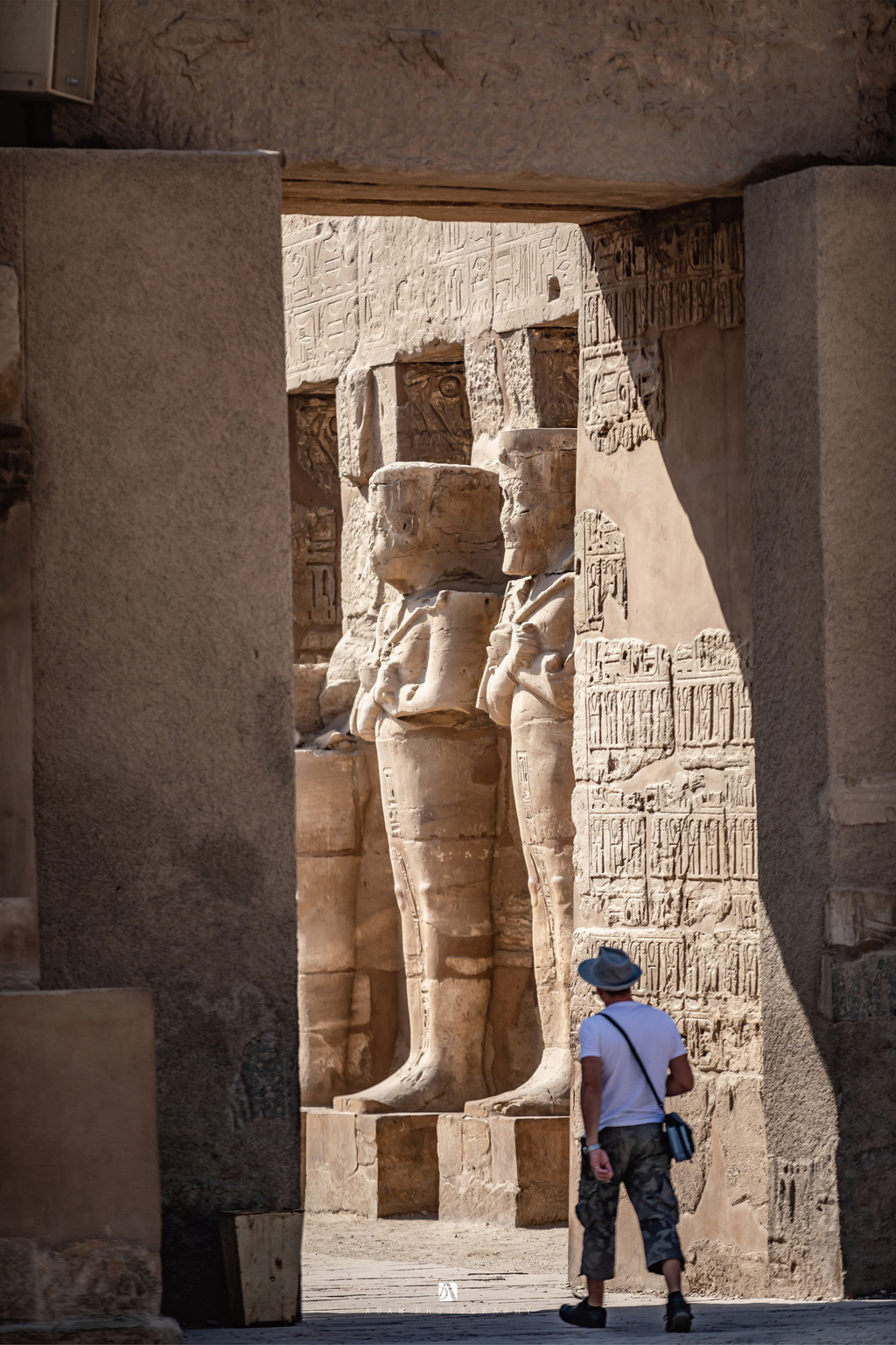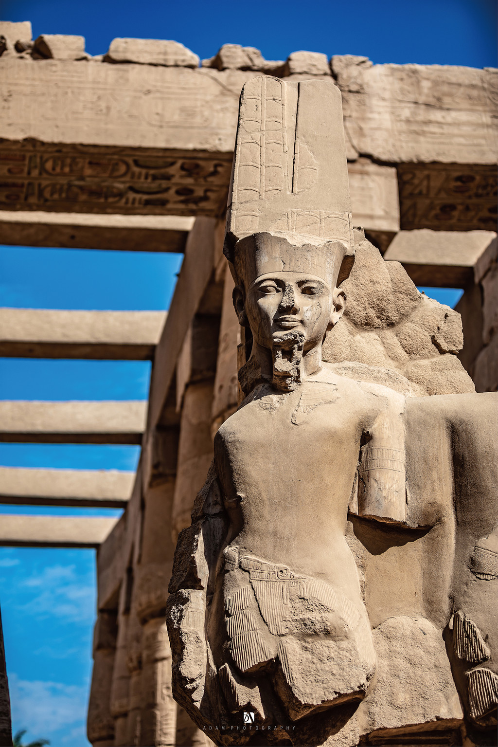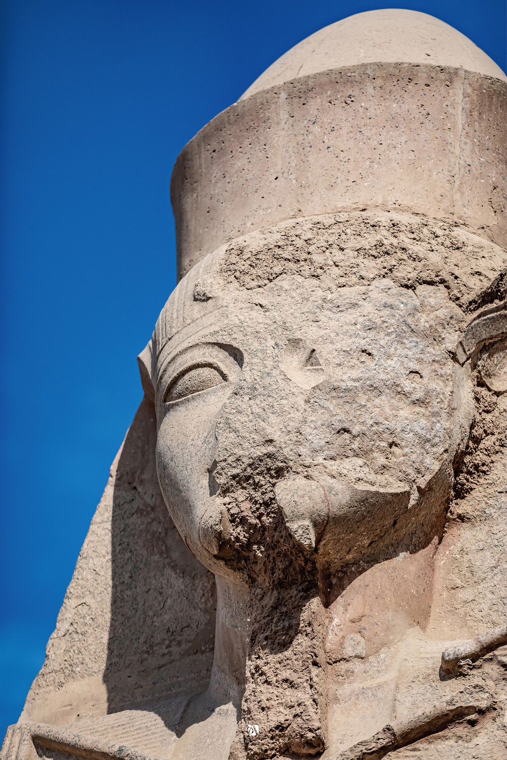 哈特谢普苏特雕像,她是一位女法老,古埃及的武则天。第十八王朝图特摩斯一世法老王的女儿。由于古埃及神话中的神都是近亲结婚,所以王室也继承了这一“优良”传统,她的丈夫图特摩斯二世是她同父异母的弟弟,这位法老体弱多病,继位不久大权就落到哈特谢普苏特手里。接着她开始女扮男装,下令所有人用男性名称称呼她。关于她的故事在后面的卡纳克神庙中还会继续提及。她男身的石像,装有假胡须,过去三千多年似乎还能看出她面目中透露的清秀。