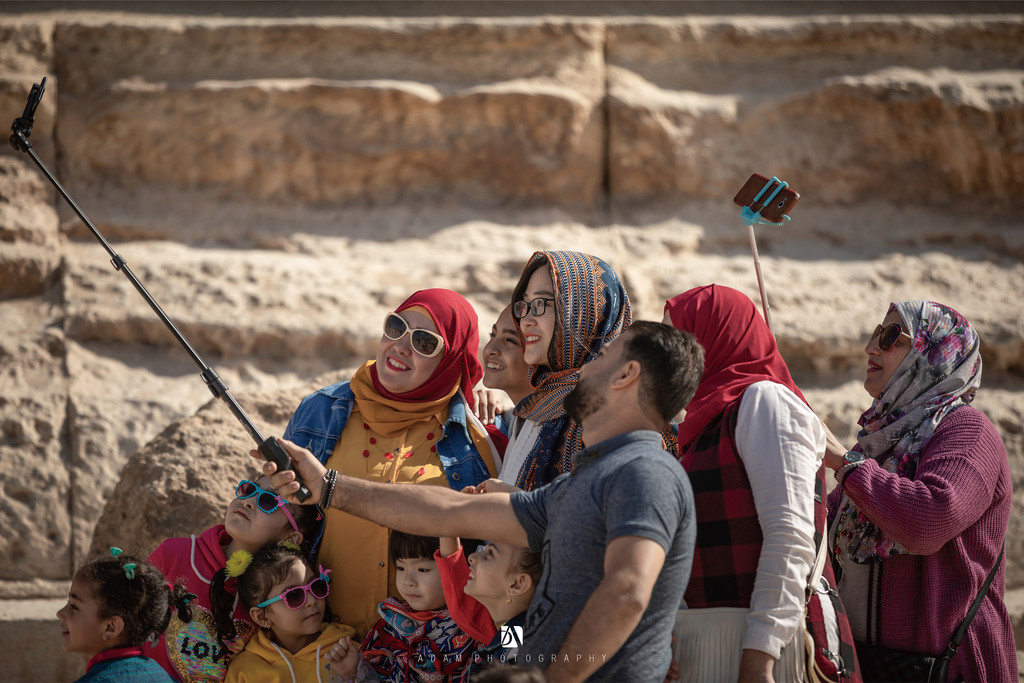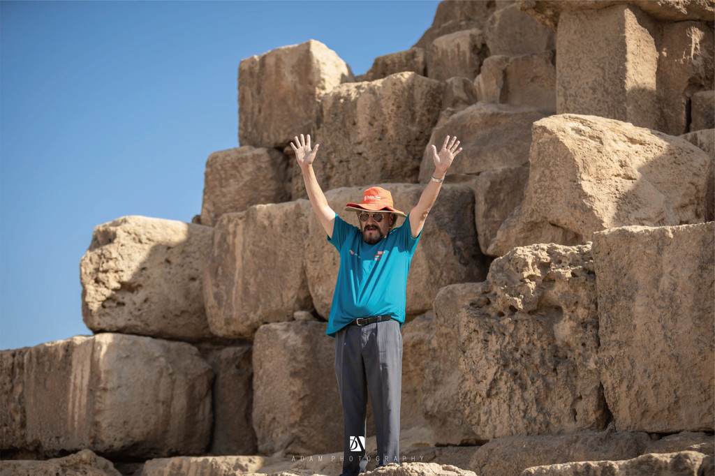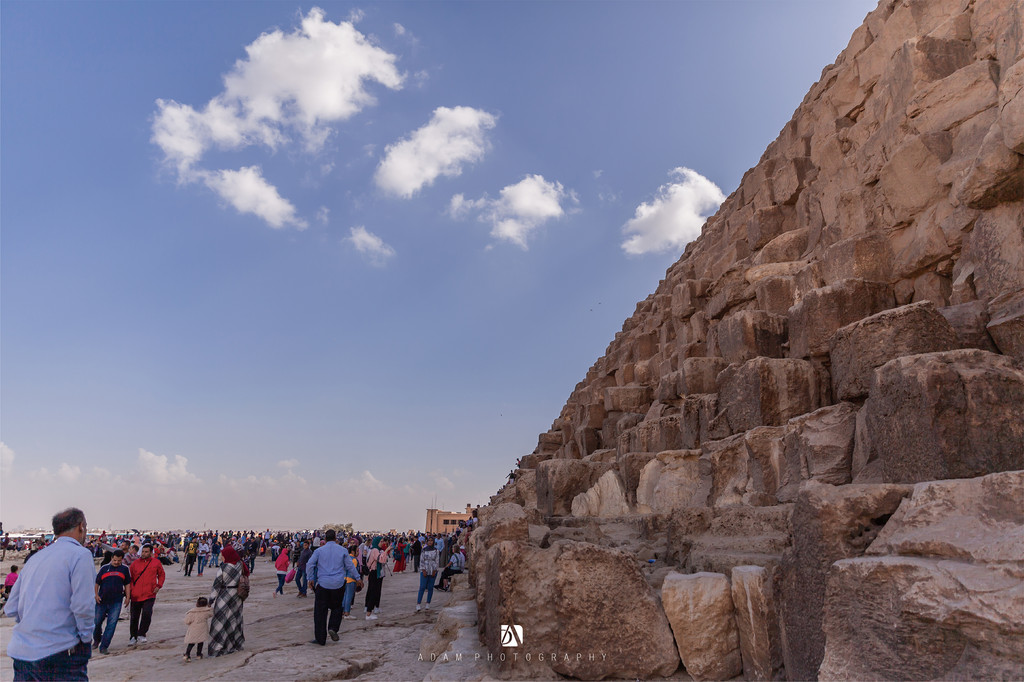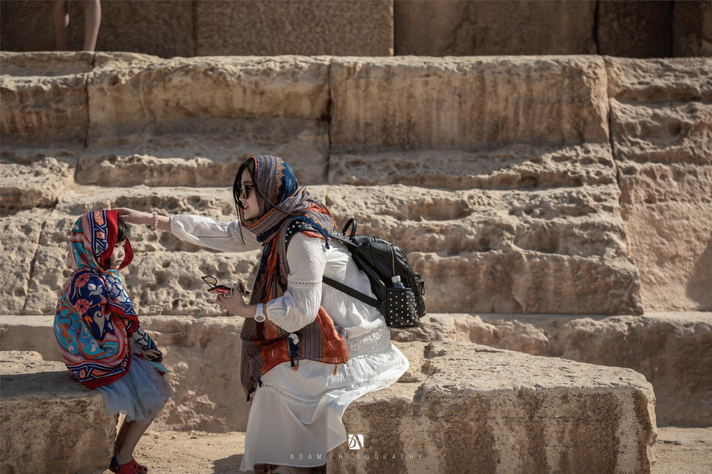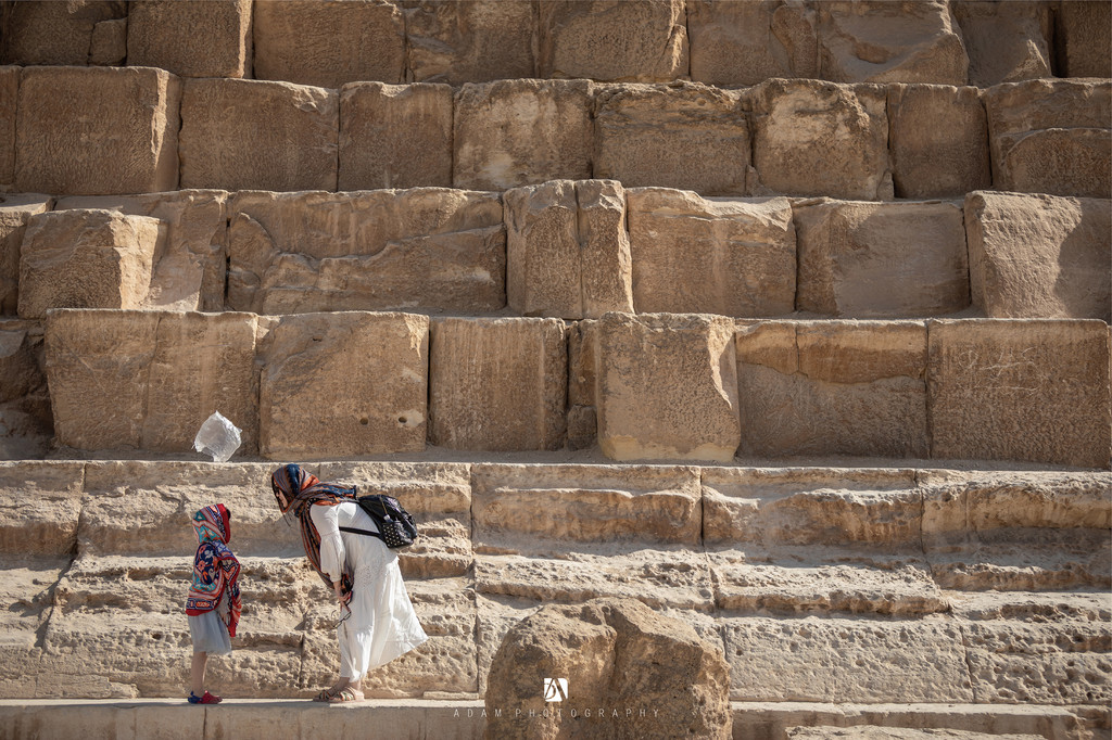 在经历一轮又一轮的合影后终于没有人再过来打扰我们,Mia今天状态不错,没有因为昨晚的疲惫闹情绪。沿着金字塔底座我们绕到了胡夫金字塔的西侧,孩爸刚爬上台阶拍照远处的哨子就响起了,一个警察制服的人手持警棍吹着口哨驱赶着攀爬金字塔的人。目前金字塔是禁止攀登的,不禁想起之前新闻说的有个德国年轻人爬到胡夫金字塔顶并全程直播,最后返回地面就被当局逮捕的故事。而在很早以前攀爬金字塔是没有人过问的,维多利亚时代在塔顶喝一杯下午茶甚至成为一种休闲活动。