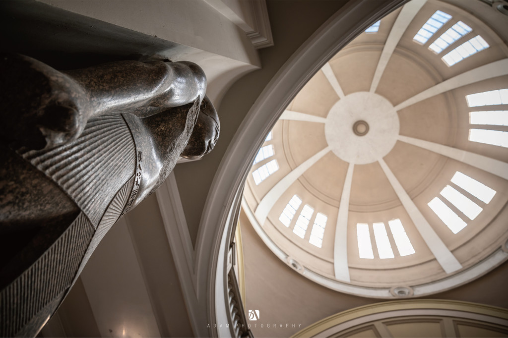 到达二层首先看到的还是巨大的穹顶。跟馆藏文物的历史相比较很难想象这个博物馆已经有上百年历史了,跟一层区别的是二层的文物大都锁柜子里。有很多体现古埃及人生活的物品,几千年的历史潮鞋、香水瓶、床榻等。还有当时的啤酒罐以及体现社会风情的莎草纸画,当时的人们在一天劳作之余晚上还要在party喝上一杯。从这个角度来看,他们对于时尚和美还有生活品质的追求较现代人有过之而无不及。