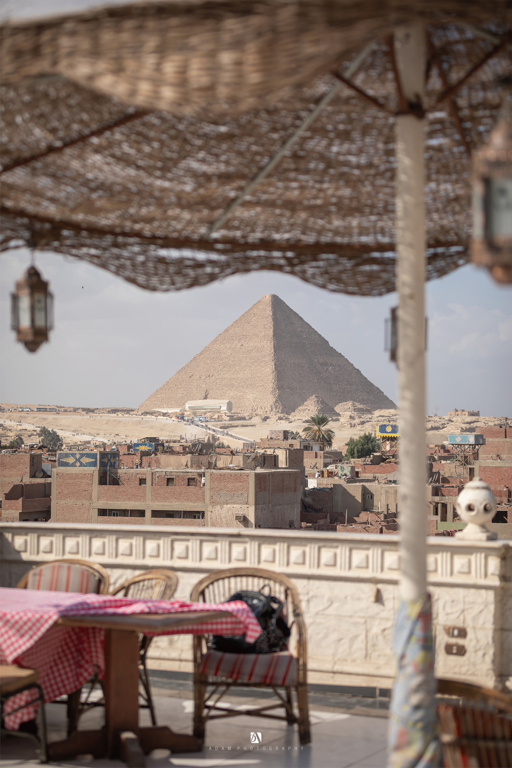 结束上午的行程,午饭在附近找了一家能看到金字塔自助餐厅,进到这家餐厅发现全是游客。穿过繁忙的大厅我们来到顶楼,在顶楼的平台上能眺望到金字塔,这也算是平衡了食物不太可口带来的遗憾吧。Mia再次被拉着拍照,这当中包括饭店的经理。餐厅内来自国内的游客此时都大显身手,拿出自己带的各种咸菜,从老干妈到榨菜萝卜和旁边的人分享着。身处异国的我发现不管多难吃的食物配上老干妈都能变成一道美食。在开罗的第一顿饭就在这种氛围中进行着,不吃辣的Mia倒也不挑食,问她埃及食物好不好吃也不回答,原来是光顾着吃没时间搭理我。在埃及,酒店房间里是不提供饮用水的,自助餐里的水和饮料也是要另外付费的,所以每天都需要买瓶装的饮用水。身处沙漠国家,我们也逐渐习惯了这种情况,在出发前和回酒店后都会准备好充足的水。