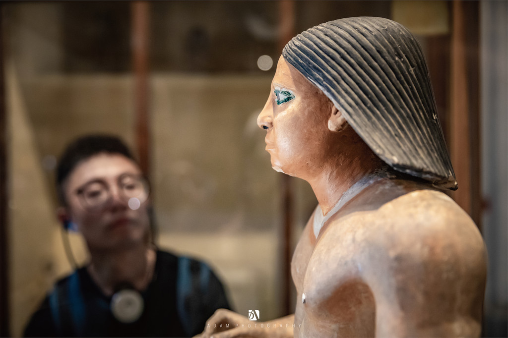 书记员坐像,是古埃及第五王朝的文物。它的眼睛是水晶制造的,在手机闪光灯照射下晶莹剔透,仿佛这尊雕像活了过来。埃及最大面额200埃磅的纸币上,就印有这位书记员的坐像,它的地位可以想象。在大多数的王室文物中,很少有反应社会其他阶层人物的,因为它的存在,历史的完整性最终得以体现。