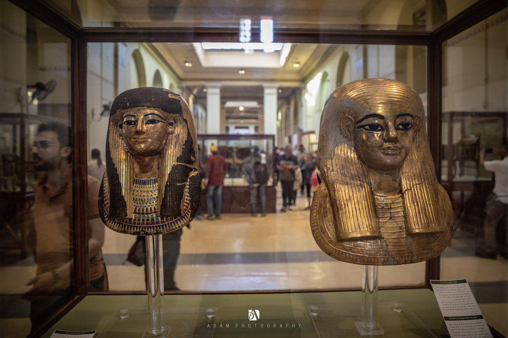 朝着图坦卡蒙展厅前进,周围都是十八王朝的文物。十八王朝我认为是整个古埃及文明中最令人着迷的,对我们的吸引力甚至超过了十九王朝的男神拉美西斯大帝。在二层的展厅里首先看到一对黄金面具,这是阿蒙霍特普三世妻子泰雅王后的父母,尤雅和图雅。感谢现代的DNA技术揭秘了他们的身份。阿蒙霍特普三世和泰雅皇后是阿肯纳顿的生父母,同时也是图坦卡蒙的祖父母。在现代科技的帮助下图坦卡蒙的父系身世得以确定『母系身世目前已经找到了木乃伊,但木乃伊的身份还是个谜,到底是不是纳芙蒂蒂王后我们无从得知,只能以KV35 Y Lady来为木乃伊命名』,从而推翻了之前的种种猜测,为我们还原了十八王朝末期的风云变幻。