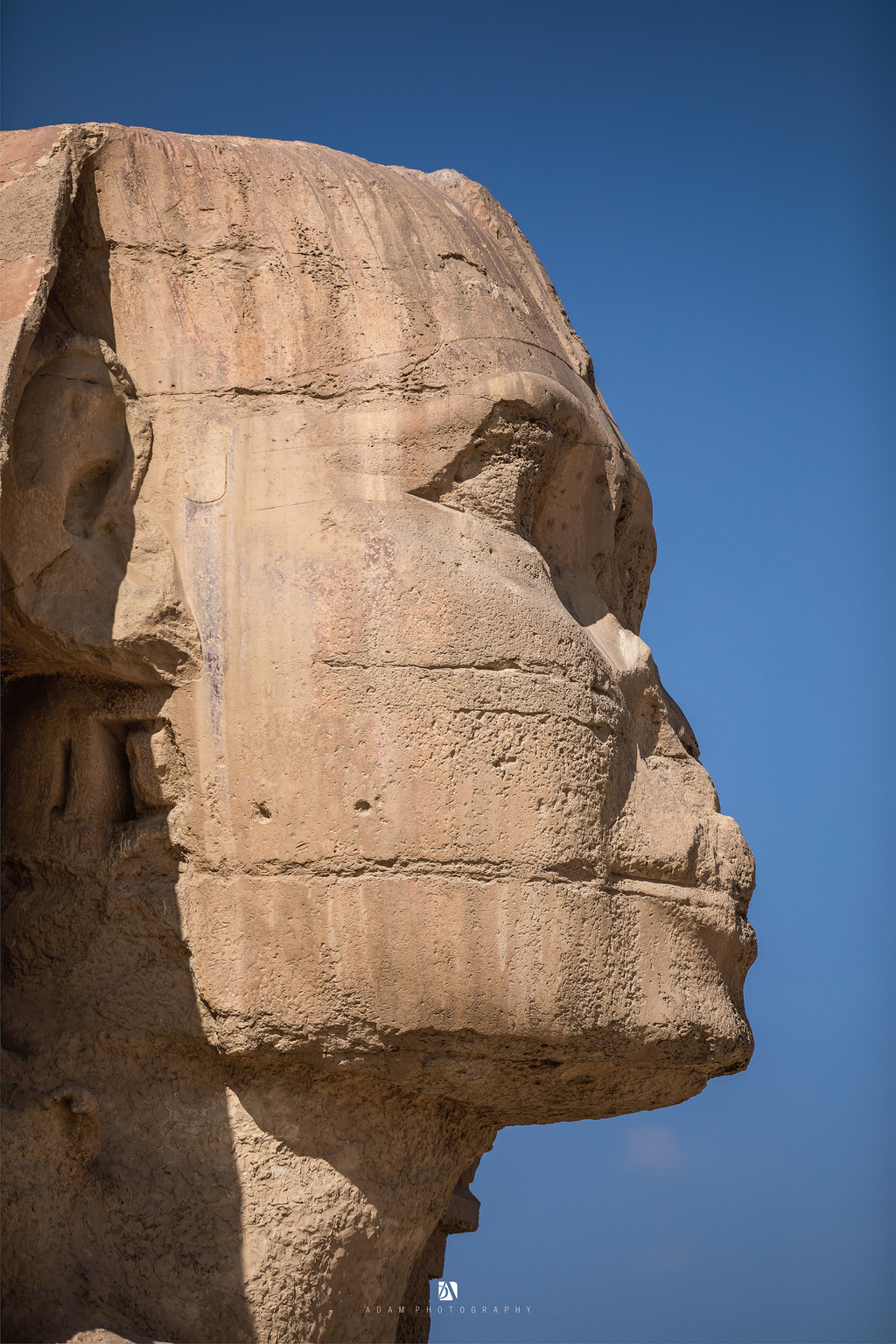 狮身人面像的入口在旁边的神庙里,这个神庙据说当年并没有完工,是为膜拜太阳神而建的场所。从一个小门洞穿过之后就是狮身人面像,门口的位置人山人海,世界各地的游客在甬道上寻找最佳的拍照位置。我们沿着旁边的坡道一路走到狮身人面像的侧面,远离人群安静的观察这个庞然大物。我告诉Mia它的名字叫斯芬克斯,在埃及神话中有三种形态的斯芬克斯分别为狮身人首、狮身羊首和狮身鹰首。坐落在吉萨的这座狮身人面是以哈夫拉的肖像为原型塑造的,高度约20米,长度有70米。爪子的长度和头极为不协调,相比较身体它的头显得有点小,所以后世也有人怀疑这个雕像原本可能是阿努比斯,后来头部被破坏改成了法老的形象,所以造成了不协调,当然这些都只是猜测。作为法老陵墓的守卫者数千年来,斯芬克斯一直被黄沙掩埋,在撒哈拉沙漠的地平线上露出一个奇异的头颅孤零零的望着东方,后来终于挖掘出黄沙下的身体,当时震惊了世界。