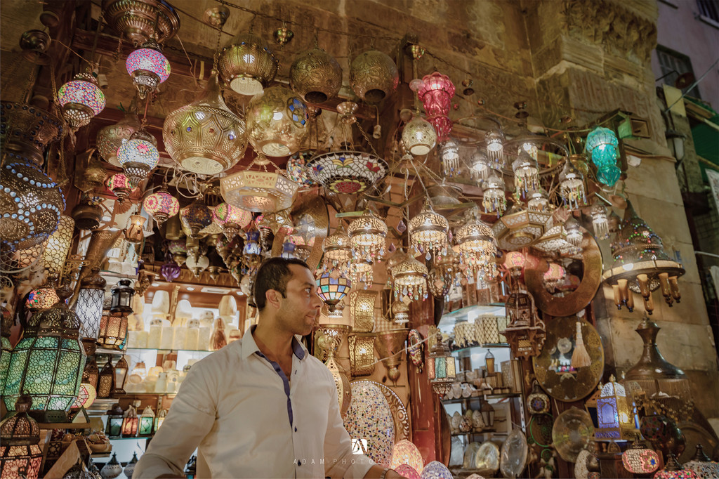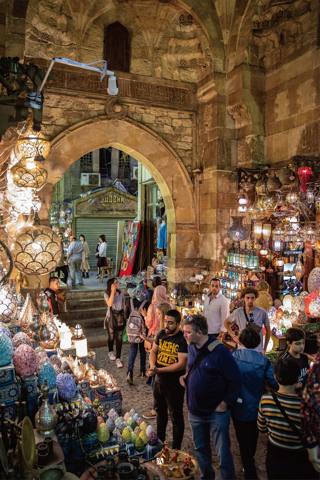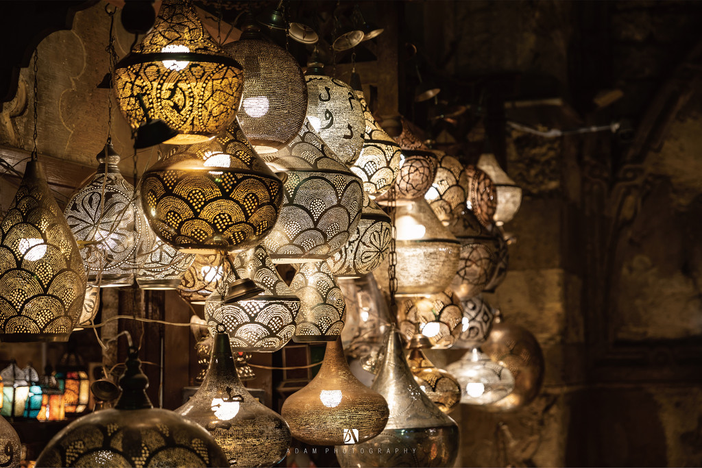广场西侧就是汗·哈利利集市,阿明还没说完话我们便一头钻进了这个迷宫,刚进去就被热情的摊贩包围了。这个古老的集市四处透露着浓郁的中世纪风格,在伊斯兰装饰映衬下,仿佛置身一千零一夜的世界中。整个集市的货架都被琳琅满目的商品占据着,几乎没有一丝缝隙被浪费。铜盘、雕刻、玻璃器皿还有纸莎草画都整齐的摆放在属于它们的位置等待着未来的主人。