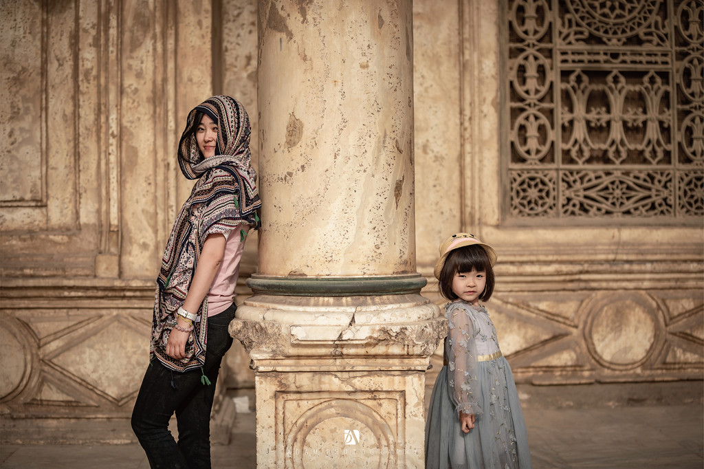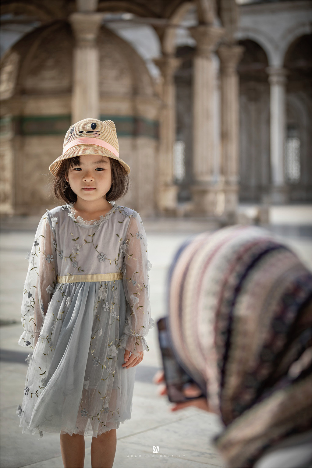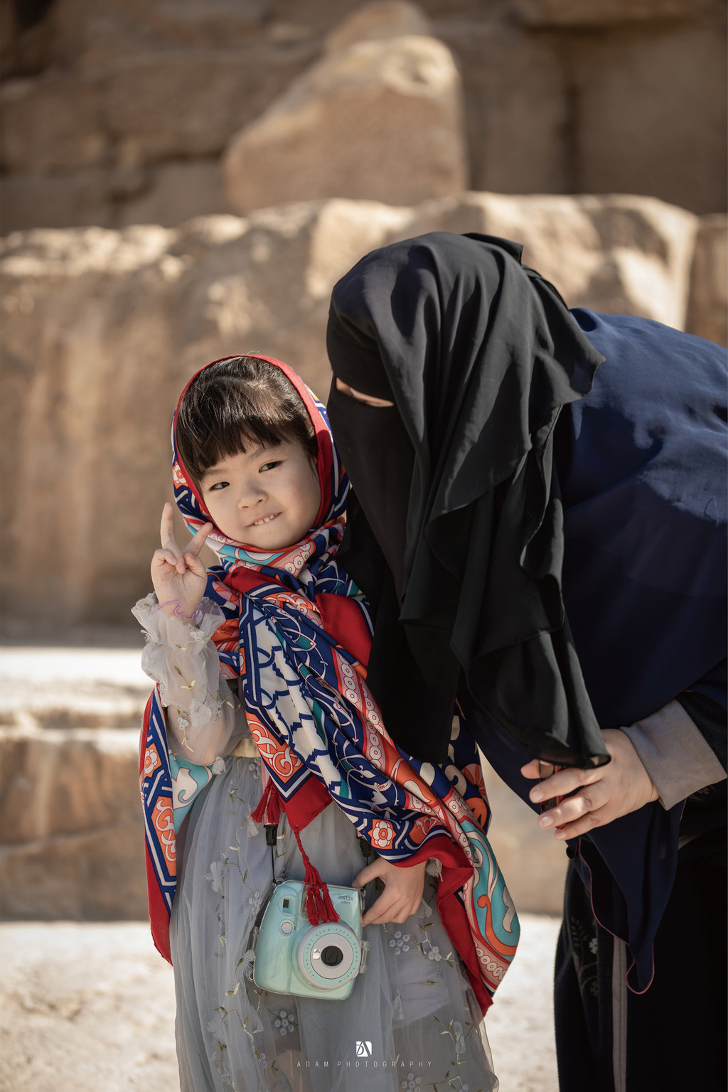 沿着底座的深色花岗岩向前走,周围都是拍照的人群。时不时有当地人上来要给我们拍照,都被一一回绝,大约用英文说了100遍“不,谢谢”后还是被人包围了。我们内心不由的紧张起来,通过简单交流知道他们也是游客,也许是Mia这种东方长相的小孩在阿拉伯世界过于特别,就像在上次斯里兰卡一样,她再次成为人群的焦点。我们无法拒绝当地人的热情,Mia也乐在其中。