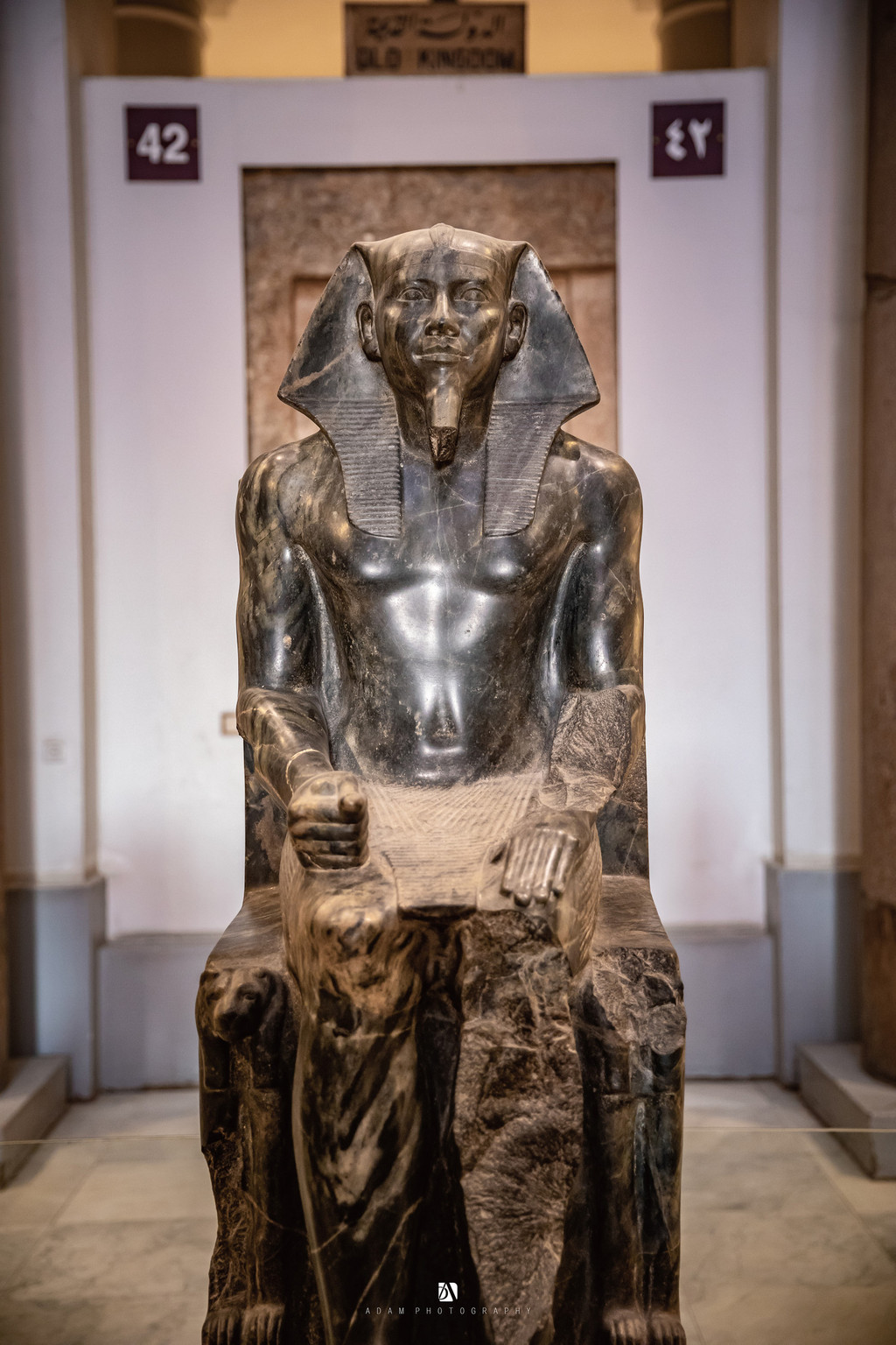 胡夫的儿子哈夫拉法老王的坐像在古王国展厅的正中央,通体黑绿色岩石,透露着法老王的威严。在脑袋的后面有一只展翅的荷鲁斯神鹰,荷鲁斯是法老的守护神,总是和法老相伴。哈夫拉雕像从正面是无法看到这只神鹰的,不禁让人感叹古埃及的雕刻技艺在四千多年前就达到了如此高度。也许正是这尊雕像的重要性,作为一个国家的标志被印刷在了埃及的货币上。