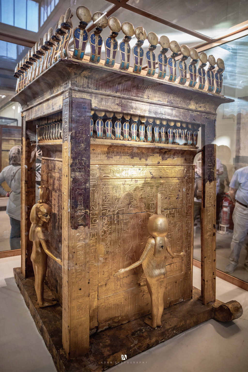 图坦卡蒙的棺椁巨大而精美。棺椁共分8层,其外是四层巨大的木制圣柜,中间为石棺,最里面三层是人形棺,内部就像俄罗斯套娃一样层层相套。整个棺椁当时几乎占满全部墓室,卡特花费了很长时间才把最里面的打开,而最内部就是头戴黄金面具的法老王木乃伊。