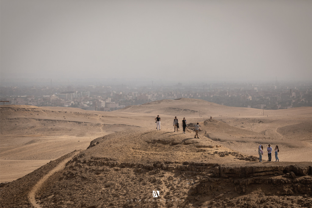Mia看见金字塔兴奋不已,一个劲的说金字塔的单词我学过,拿着拍立得学着她爸的样子拍起来没完没了。在金字塔的西南方向,能同时看见三座金字塔一字排开。中间的哈夫拉金字塔显得尤为巨大,从视觉上超过了他的父亲胡夫。聪明的国王知道自己塔尖高度不能超越父亲,于是选择了地势更高的西侧,终于满足了自己睥睨天下的愿望。坐在沙地上远望金字塔,时间在此刻仿佛停滞,回想起18世纪旅行者的感慨,现在的我也被这些岿然不动的躯体而深深震颤着。