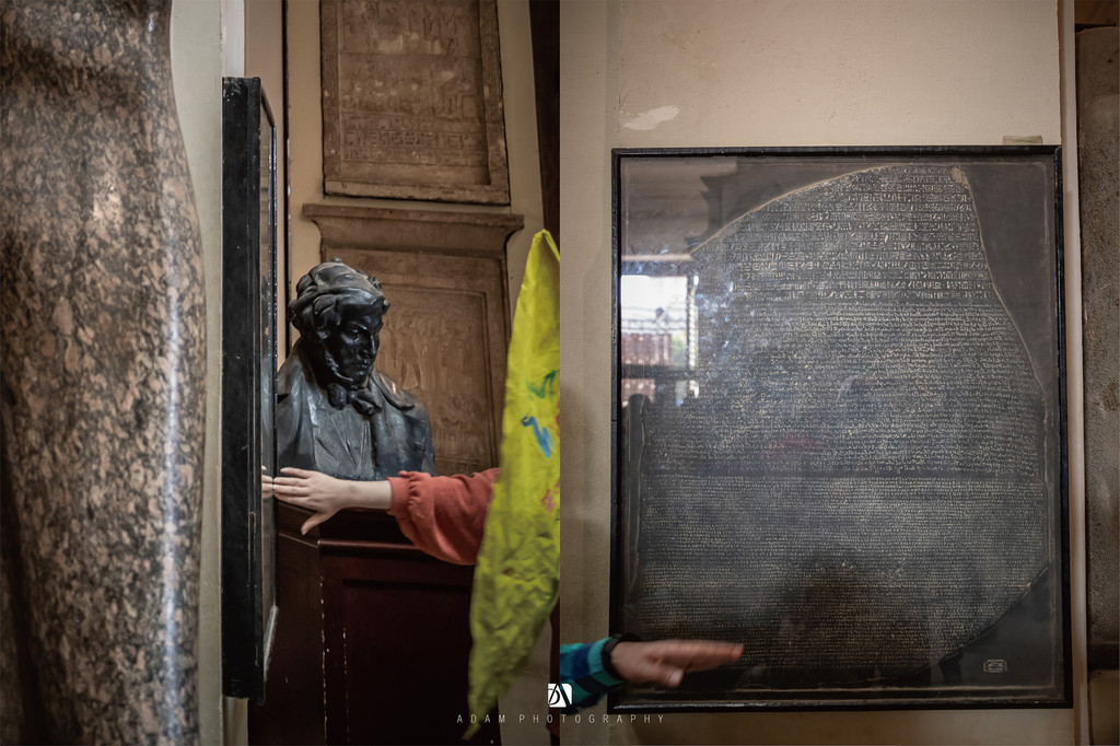 大厅的穹顶下立着不同时期法老的巨型雕像。在其中一尊旁边有一个不起眼的石板拓印件,这就是世界顶级文物罗塞塔石碑,真迹目前在大英博物馆,是大英博物馆的镇馆之宝。这块石碑的重要性不言而喻,因为他是一座通向古埃及文明的桥梁,在凯撒大帝引燃亚历山大港开始,蔓延的火苗将亚历山大图书馆的藏书付之一炬,之后的东罗马帝国遣散了通晓古埃及文字的祭司,关闭了神庙,遗迹尚存的古埃及文明彻底毁灭。对于古埃及和全人类来说这是可悲时代。中华文明之所以能5000年屹立在世界的东方就是因为文化的传承,其实也就是文字的传承。
