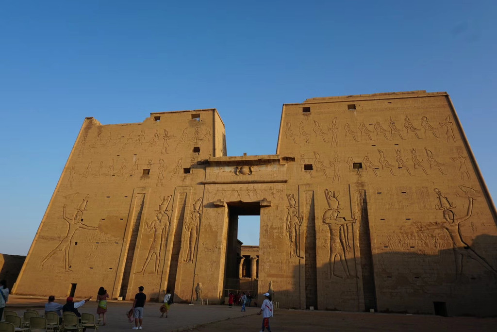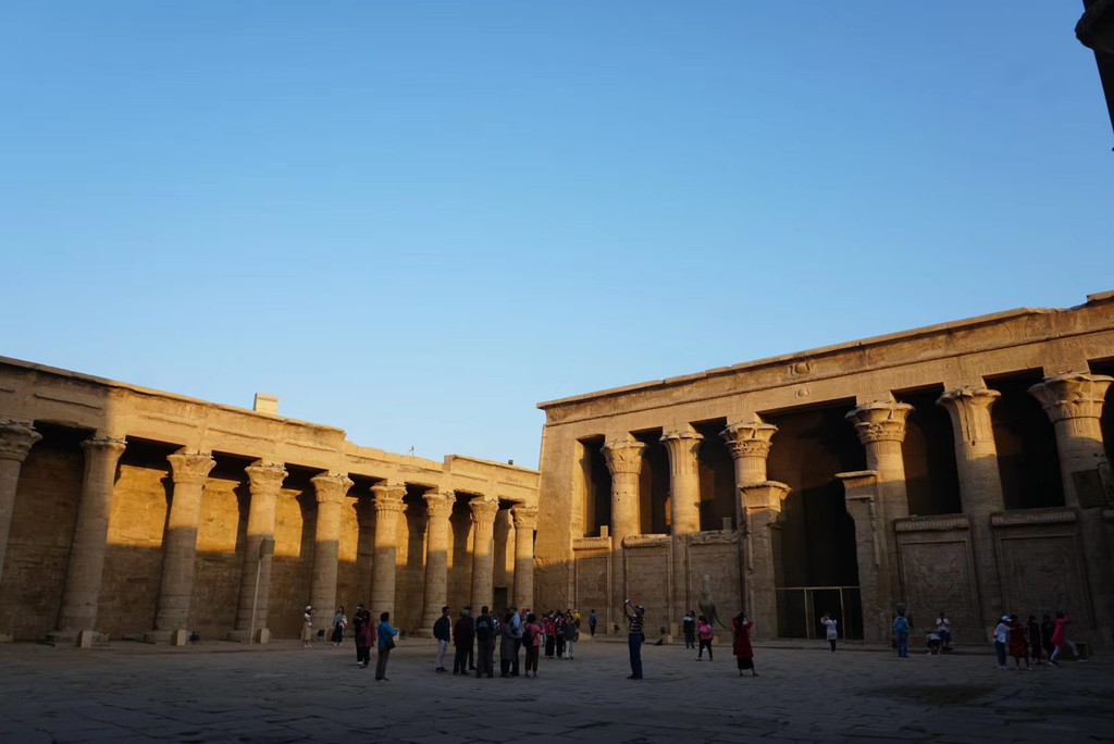 船到达荷鲁斯神庙附近天还未亮,选择马车到荷鲁斯神庙,清晨的街景让我兴奋。到达时太阳洒在黄色的城墙和柱子上散发着金色的光。表达复仇的人像显得尤为壮观,千年前的荣光仿佛从未离去。