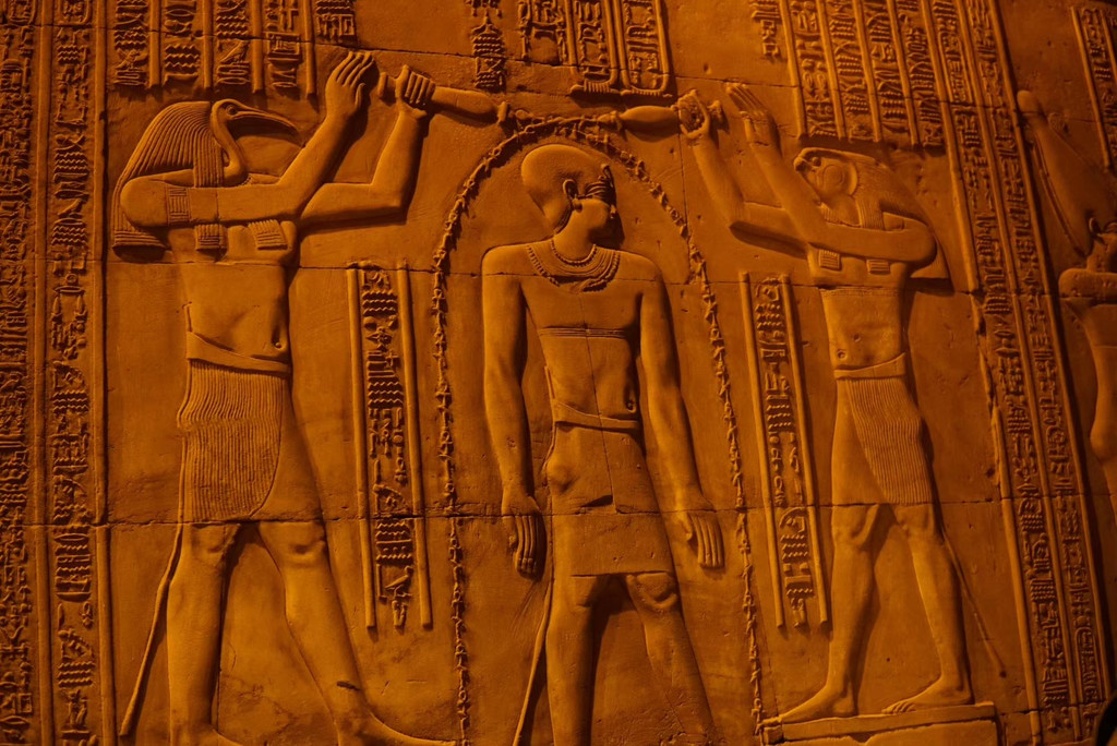 荷鲁斯神庙最让人触动的是,千年前,人们从埃及不同的地方聚集在此彻夜欢庆,由祭司将神牛从两侧的甬道抬到最顶端吸收太阳的力量。在甬道里各种石刻表现着当年的画面,跃然于上,仿佛耳边还有人声的喧闹,尤为奇妙。