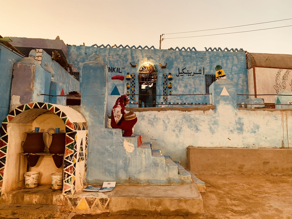船启程总是要很长时间,据说附近有个努比亚村,同行人凑了个小队找了个导游去探访小村子。努比亚是埃及的少数民族,非洲人种,挺黑的。觉得骑骆驼在这里比撒哈拉里面有趣多了。顺着尼罗河坐小船,快傍晚阳光让尼罗河两岸显得特别的温柔,安逸。登录村庄是在一片沙滩上,坐了快30分钟骆驼才到了村落。地方不大,家家户户的房子被装饰的特别好看,颜色艳丽。游客很少,但是本地人还是会看见你拍照就想收钱。本来一个美丽少女在蓝房子前安静画画,挺美,当你抬起相机,少女爸爸就对你喊“one doller one doller”瞬间好感度下降100%。