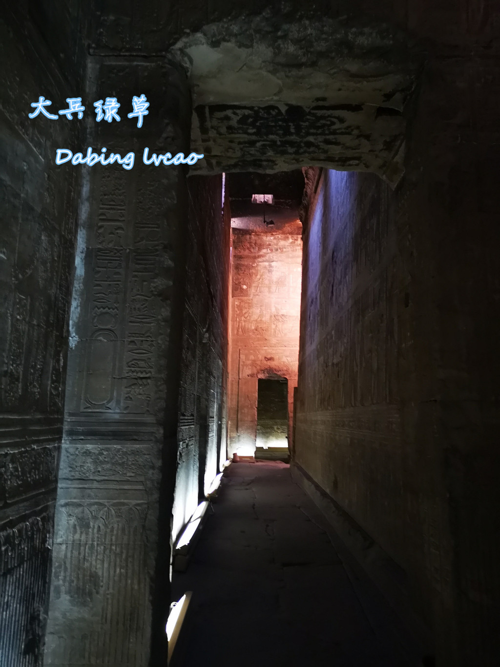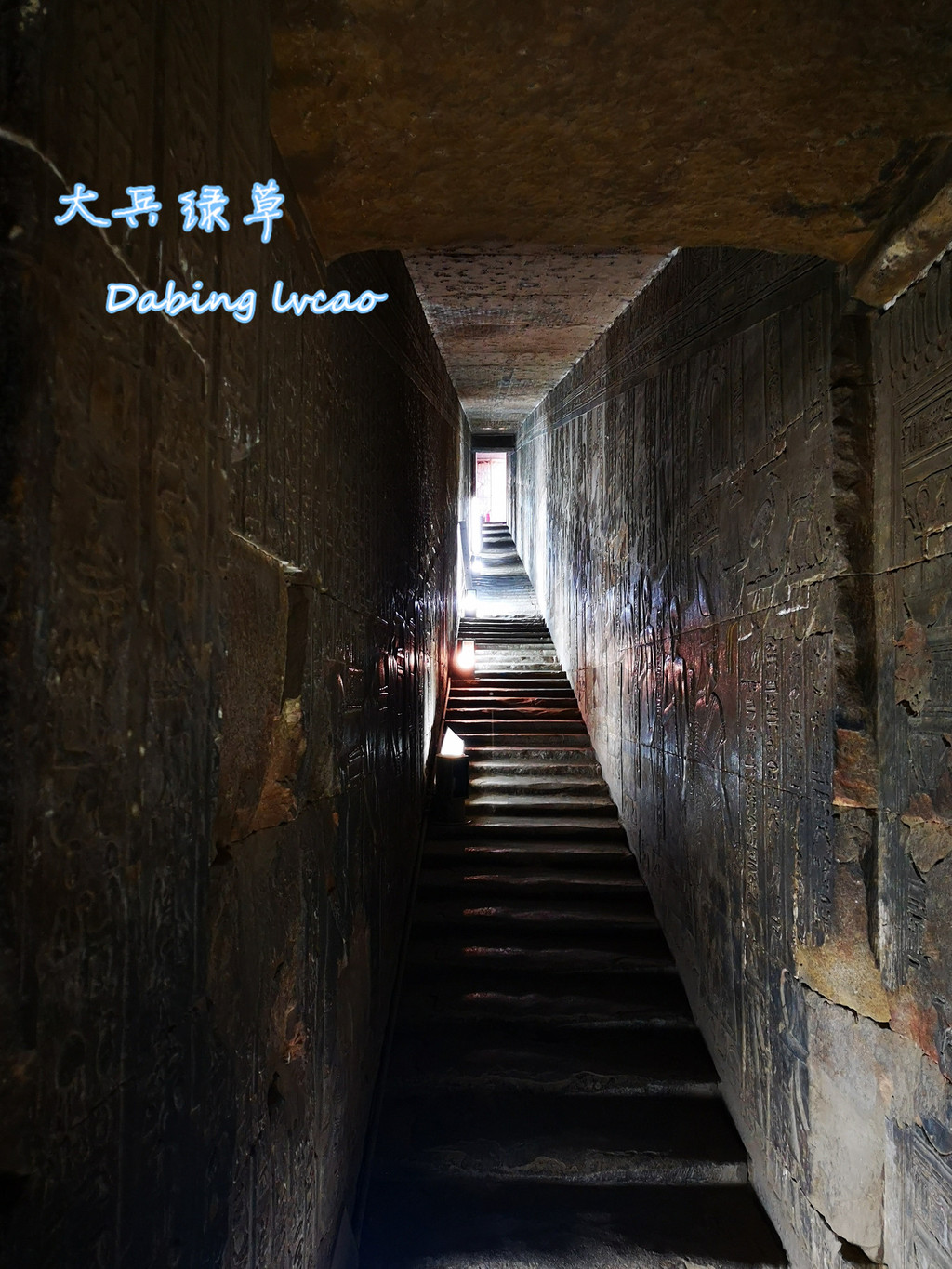丹达拉神庙还有一个值得看的地方是神庙的地宫,它位于神庙正殿一个昏暗的走廊尽头,地面上有个仅容一人能下去的洞口,有阶梯通到地宫。沿着阶梯下到洞底,再往前走2、3米,钻过一个矮门,一条宽不到1米、高不到2米的地宫出现在面前,洞口正好在地宫的中间,两边各深约5、6米,地宫墙壁上雕刻着各种的浮雕,这些浮雕是全埃及保存得最完整的浮雕,优美得构图,精美得雕刻,完好如新。据说地宫过去被泥沙填埋着,使这些浮雕免受破坏。