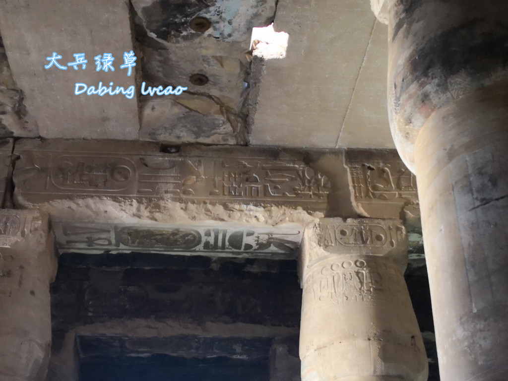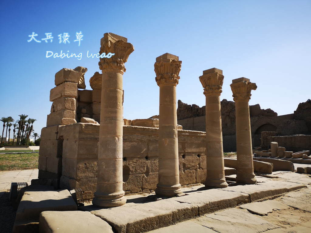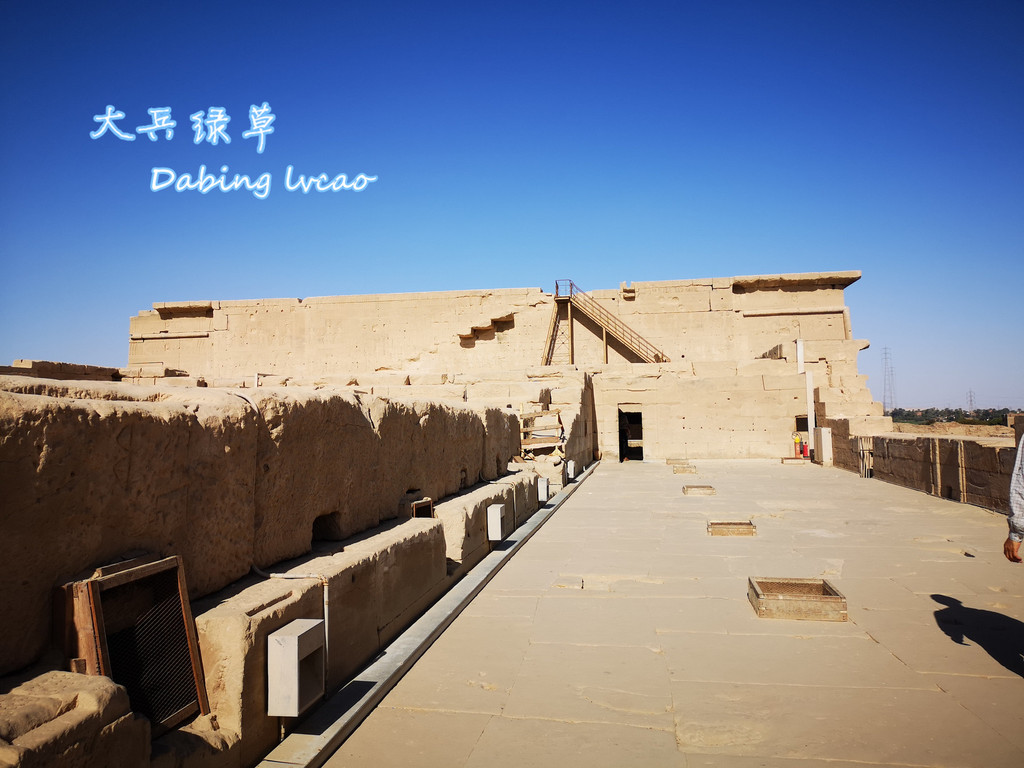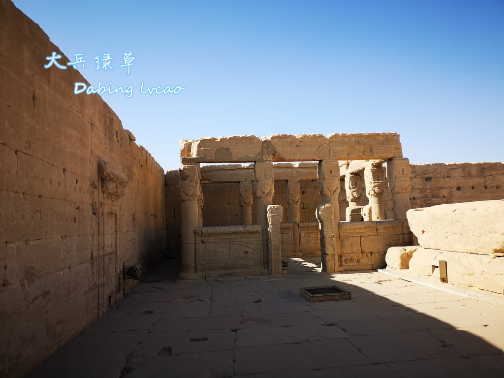穿过狭窄的楼梯甬道,来到神庙的二层,首先看到的是这座只剩几根柱子的凉亭,据说是为埃及艳后克利奥帕特拉而建的.