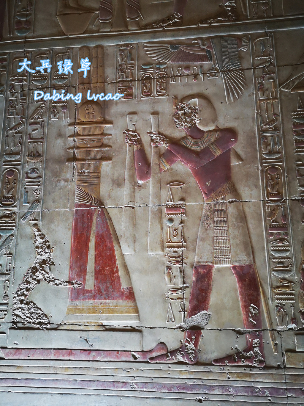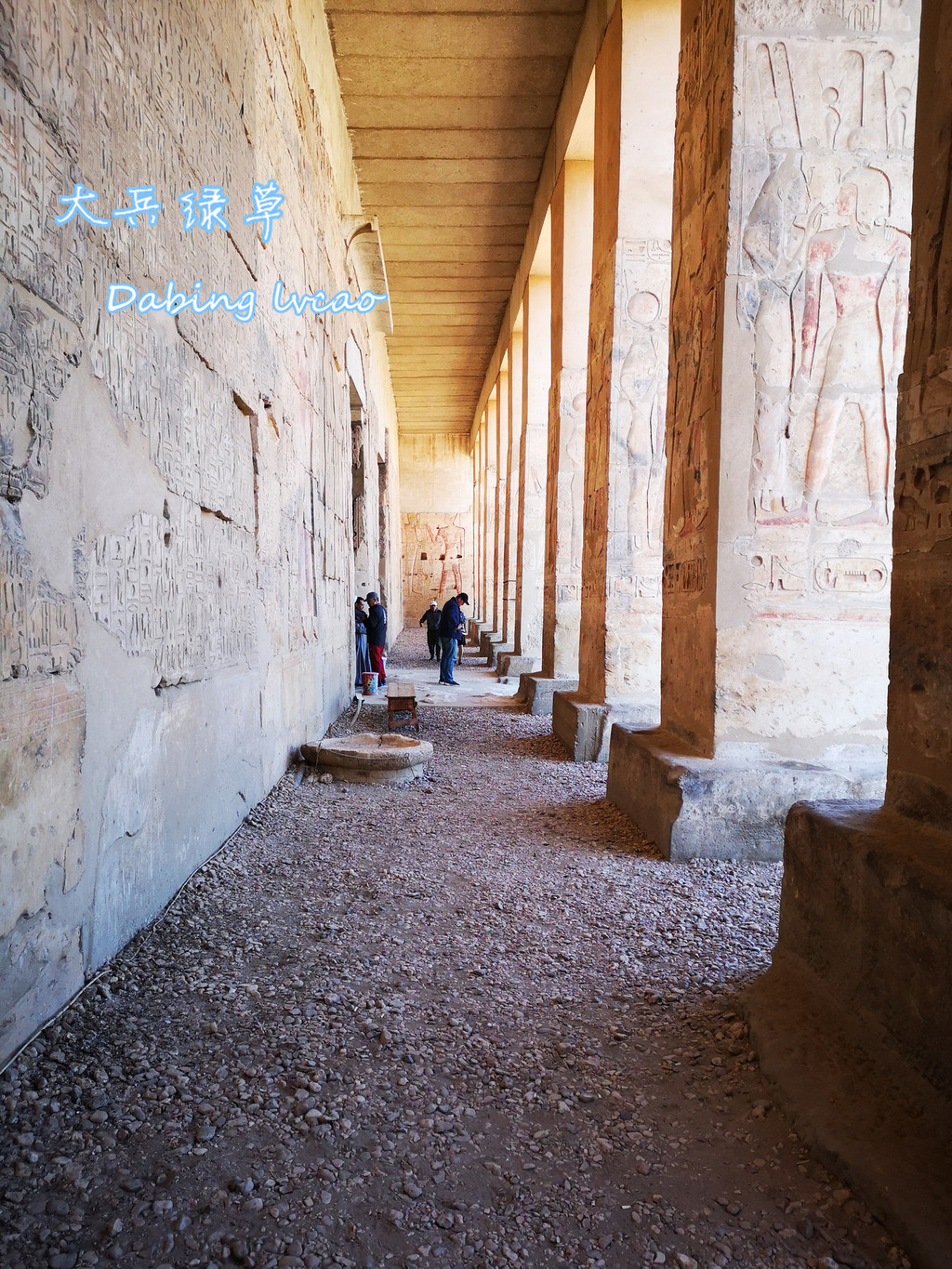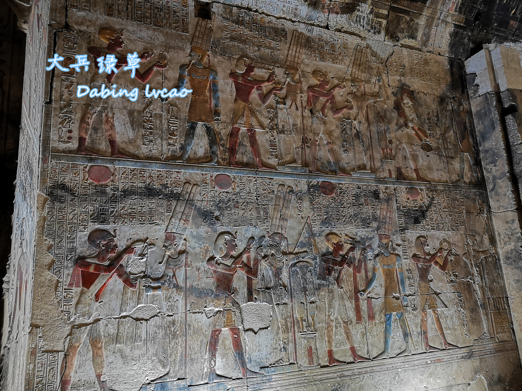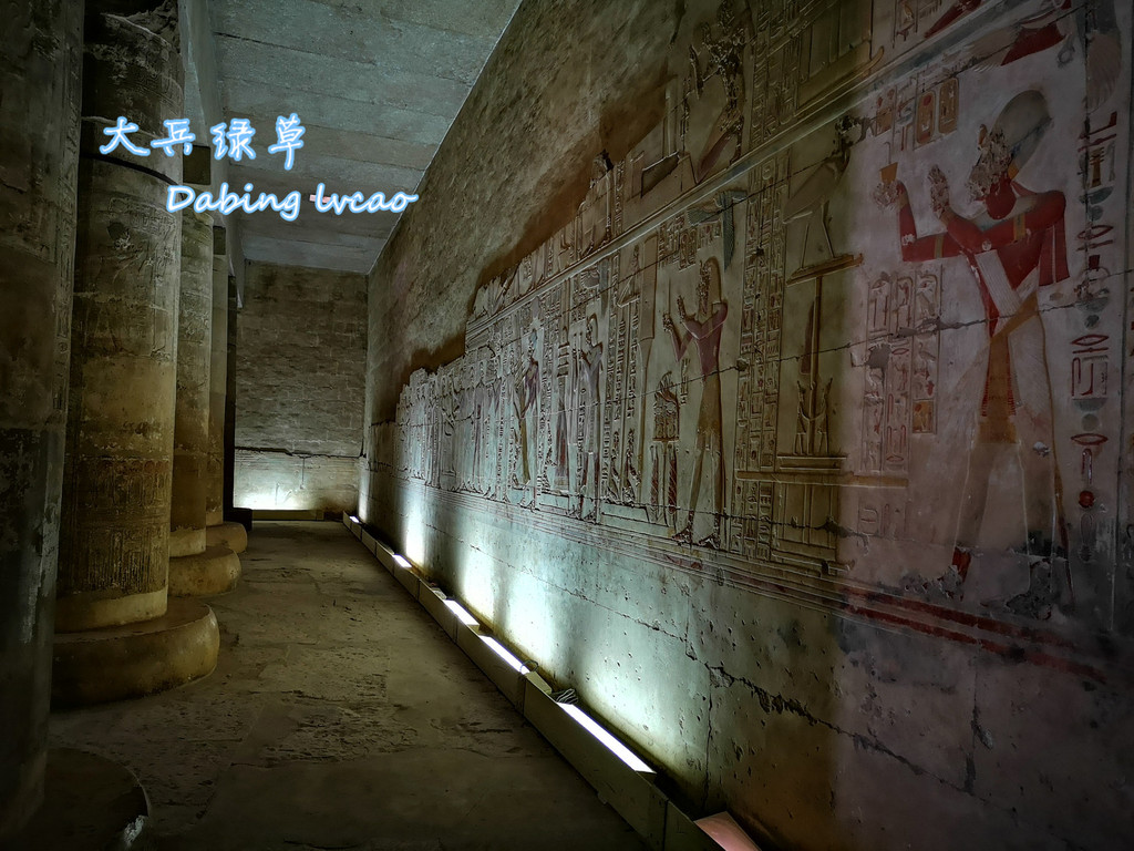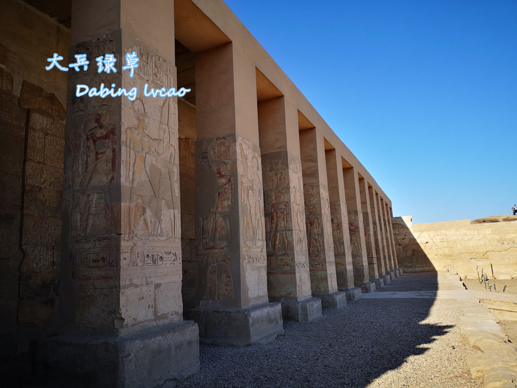 阿拜多斯神庙正殿前有12根方形立柱连廊,显得威严端庄,立柱上刻着女神伊西斯和冥神奥西里斯对法老的祝福,令人惊奇的是这些壁画颜料直到现在还依然鲜艳,这可是三千多年前的作品啊!