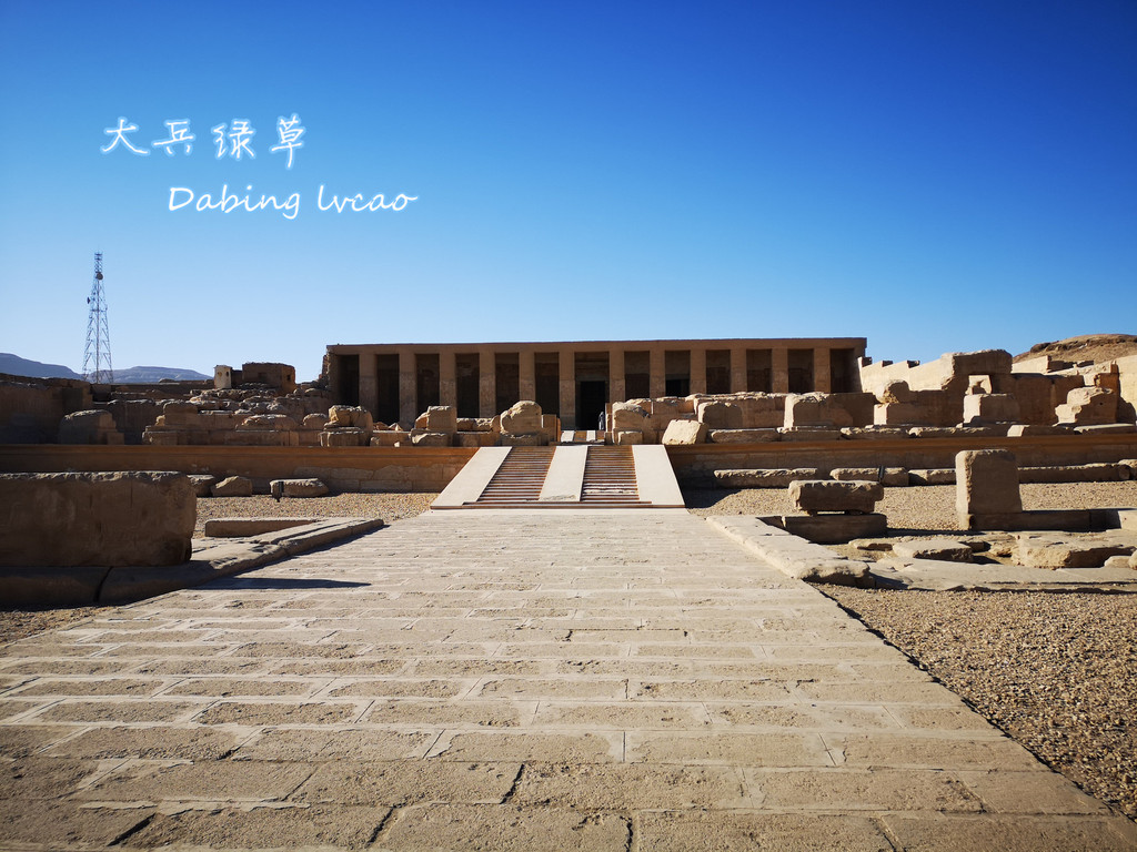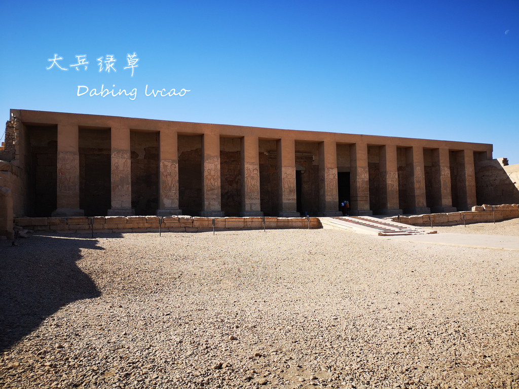 这座神庙是塞提一世为供奉冥界之神——奥西里斯而建的一座的衣冠冢,建筑风格上仿照古王国的形式,但建筑格局上却放弃了神庙常见的矩形布置,而采用了“L”形独特布置。