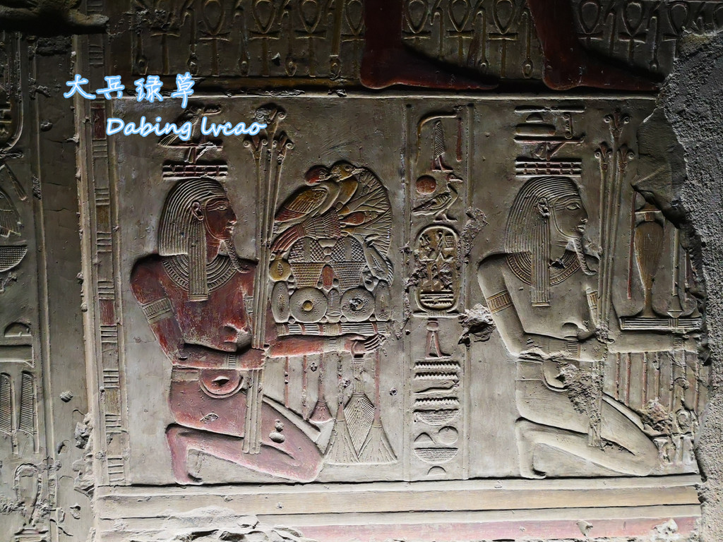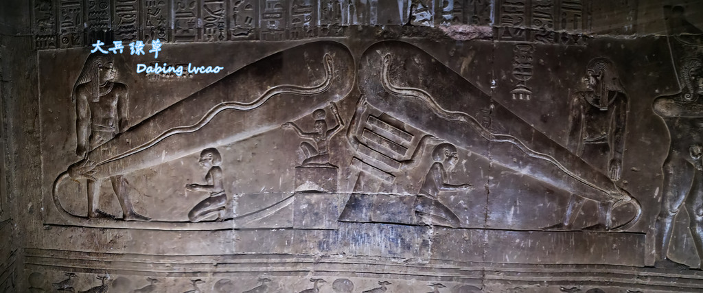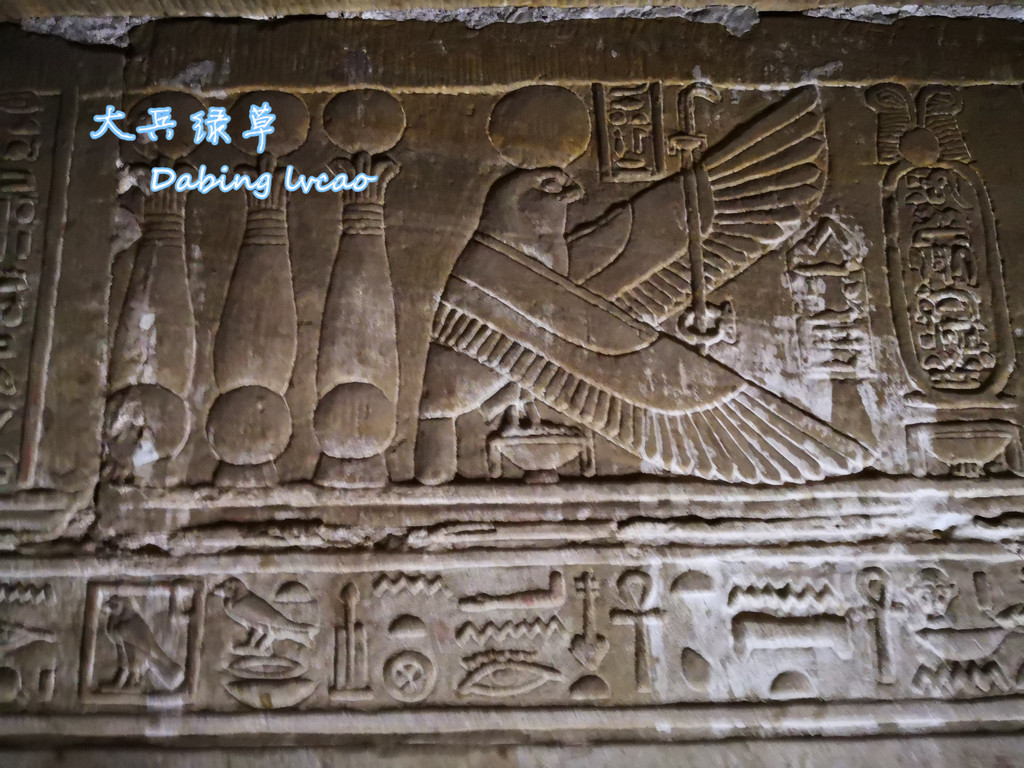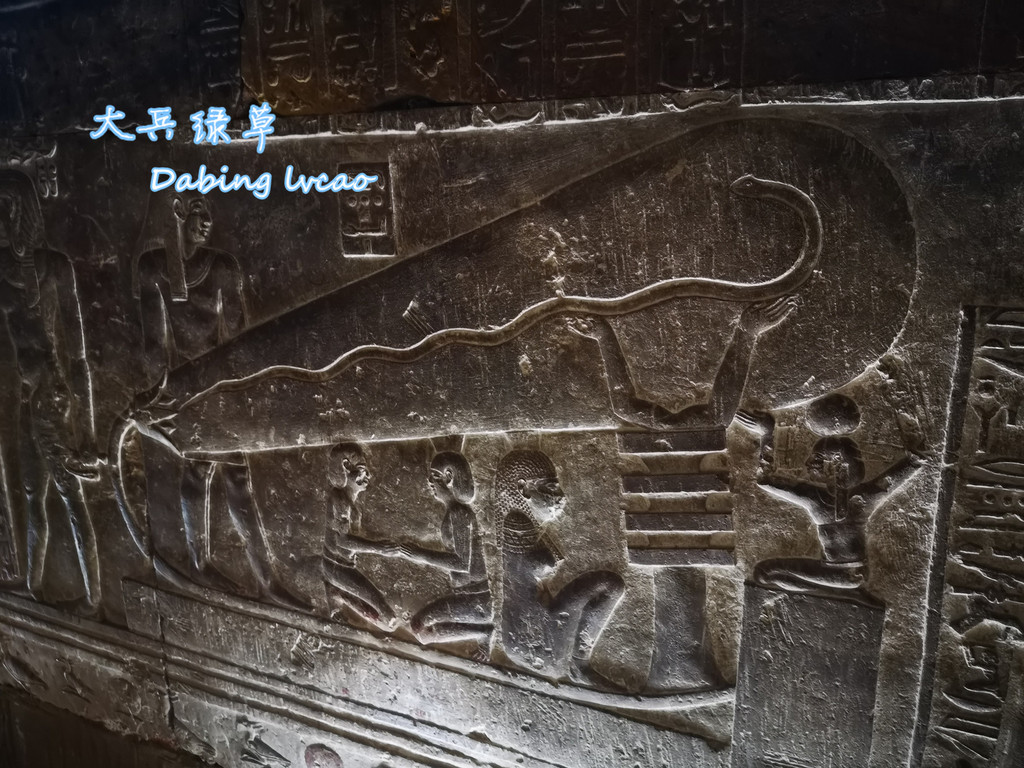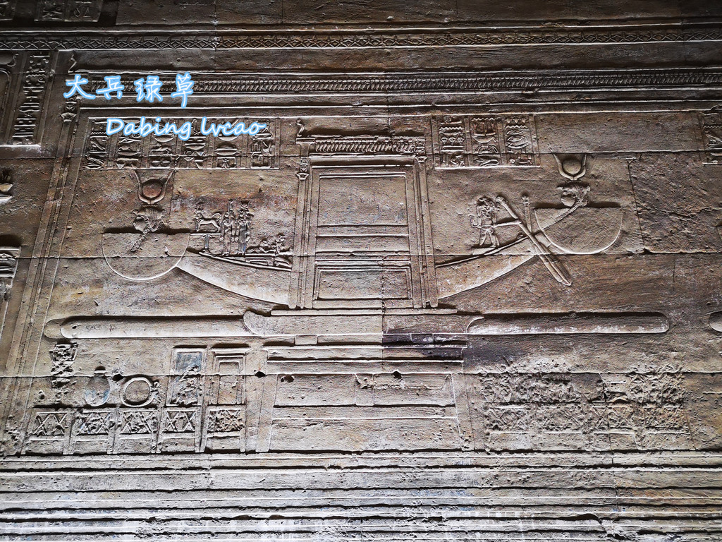 阿拜多斯神庙还有一个神奇浮雕,这就是著名的直升飞机、潜水艇雕刻,多柱大厅的一段横梁上,有全埃及最神秘的象形文字,特别像直升机和潜水艇,它们的发现给人们提供了无限的想象空间