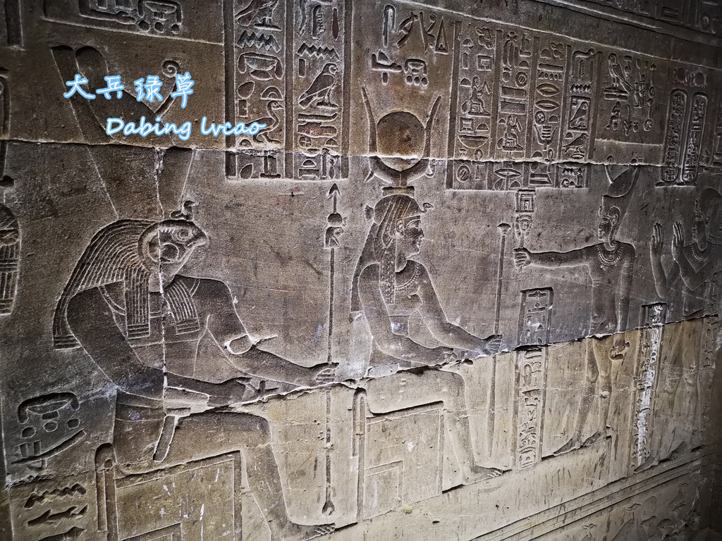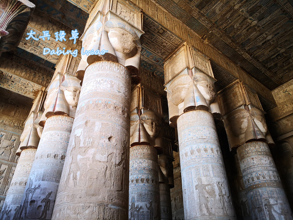 哈托尔(Hathor)是古埃及神话中的爱与美的女神、富裕之神、舞蹈之神、音乐之神。她关怀苍生,同情死者,同时也是母亲和儿童的保护神。同时,她还是荷鲁斯的妻子,每年夏天这里都有一个庆典活动,祭司们把哈托尔的雕像从神庙中抬上船,溯尼罗河而上,送到供奉荷鲁斯的埃德夫神庙,让他们二人相会,算是埃及版的牛郎织女七七相会吧。