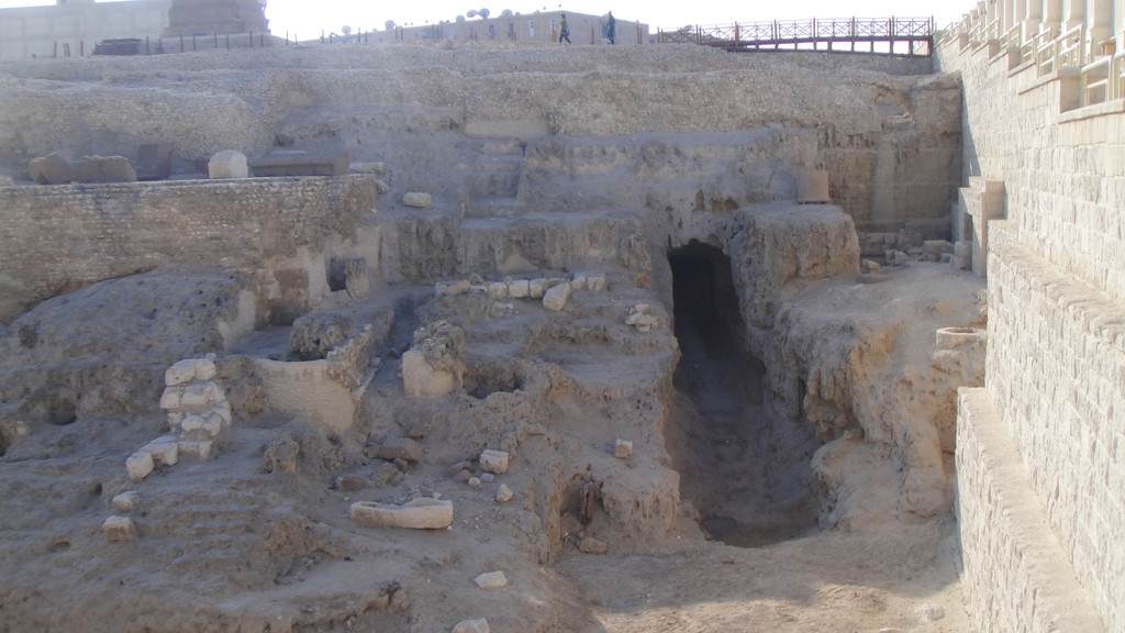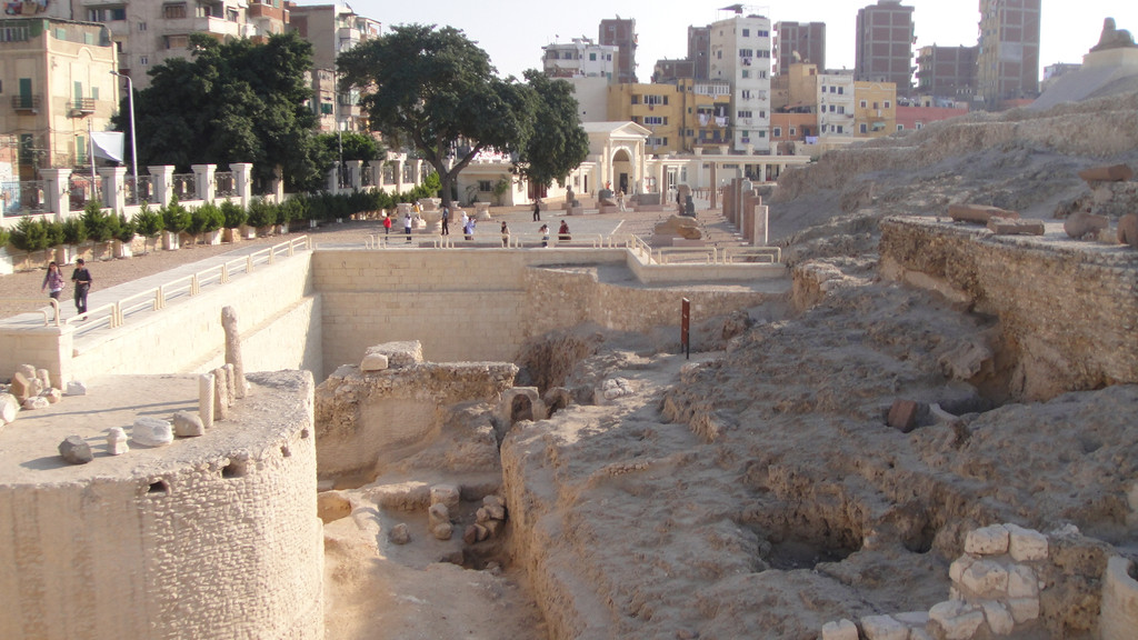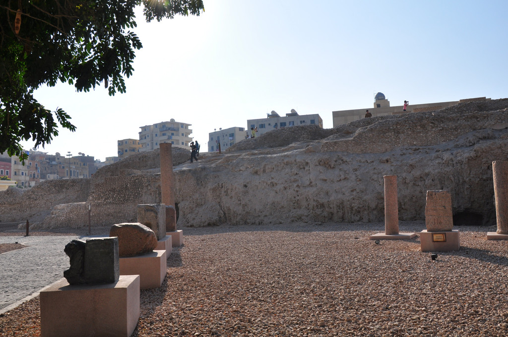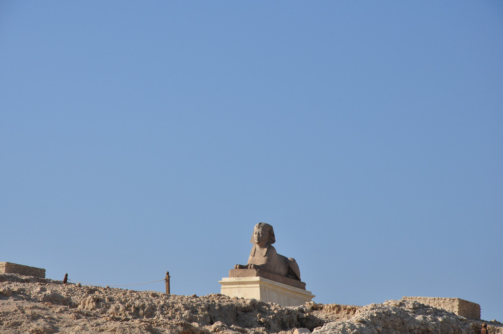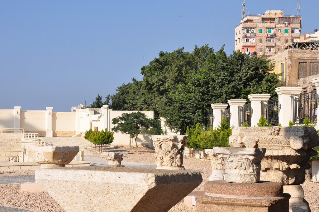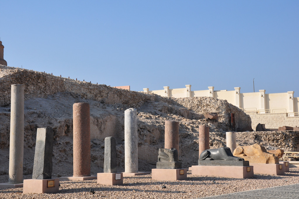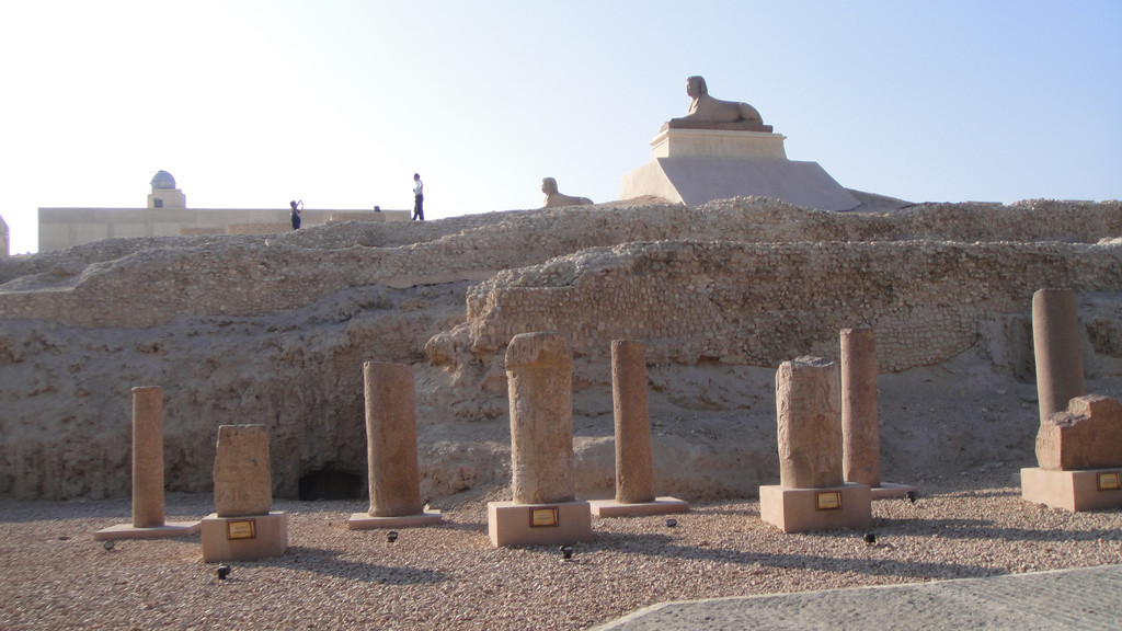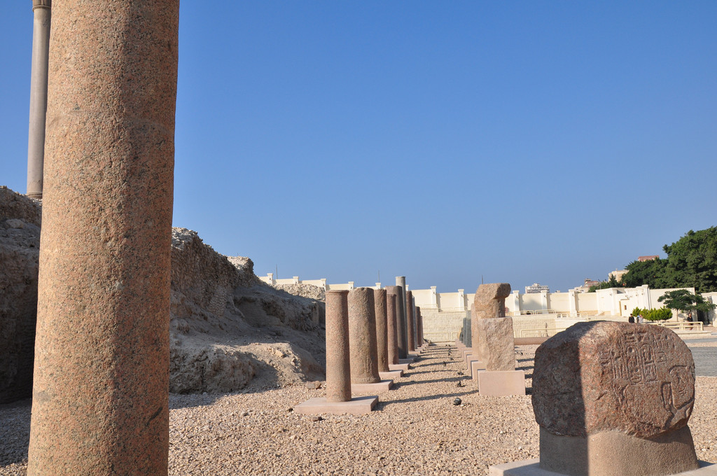 庞贝石柱又称骑士之柱,高26.85米,是一根完整的粉红色花岗石,石柱下匍伏着两尊狮身人面像。它曾经是一位罗马皇帝建造的萨拉皮雍神庙的一部分,历经沧桑,神庙被毁,仅留下这根柱子。它的脚下是巨大的神庙遗址,遗址的四周是当地居民楼房,遗址中摆放了许多石碑石刻,完全就是一座巨大的露天博物馆。2000年来,它孤独地耸立在这里,看尽人间悲喜,如今成为亚历山大城的标志。到了埃及后,发现这里到处都是上千年的古迹和文物就这样在露天与人们和谐相处,不过这些文物实在是太大了,也无法盗走。我原来以为只有埃及金字塔前面才有狮身人面像,来了后才知道这里到处都有这样的塑像。