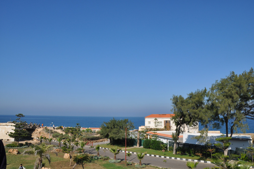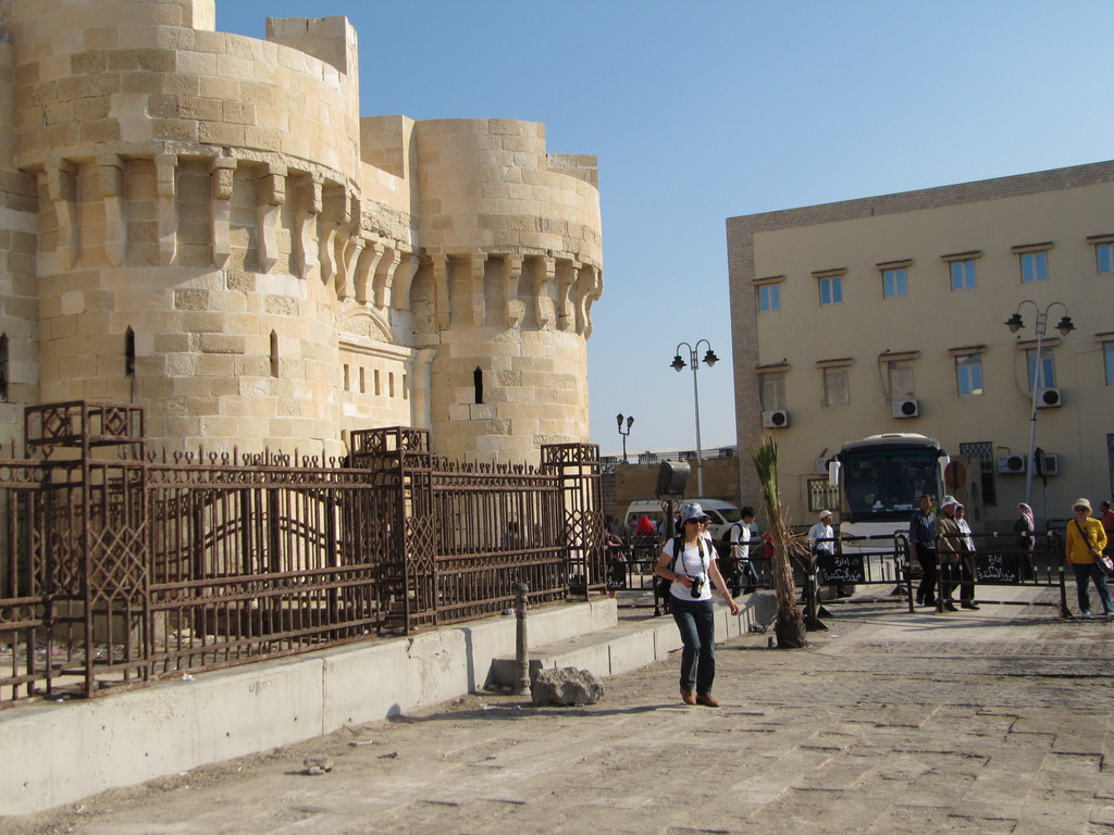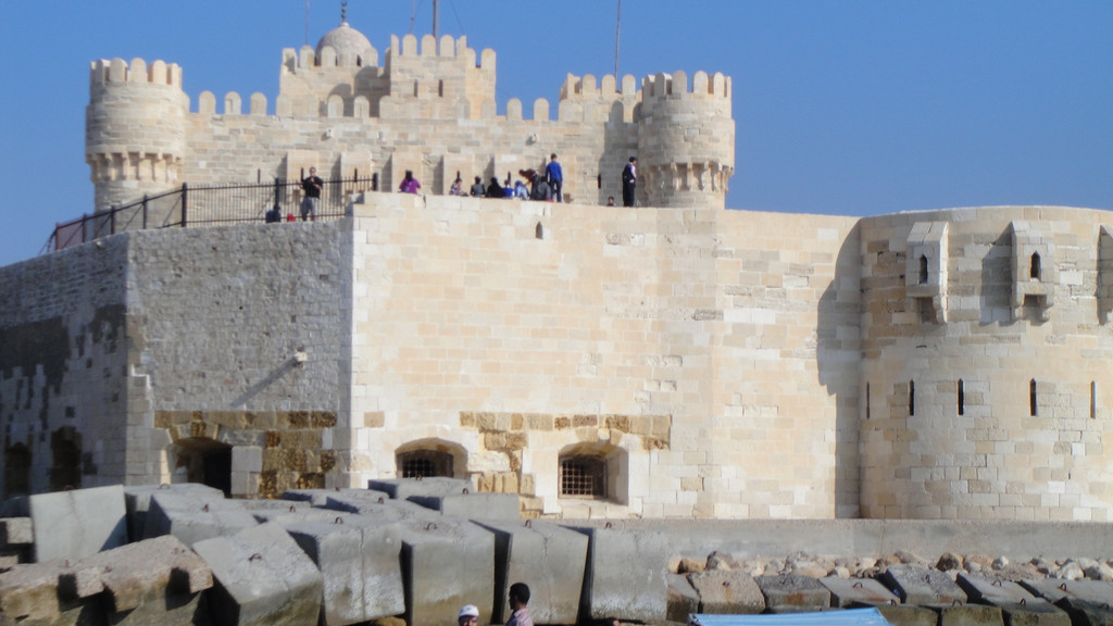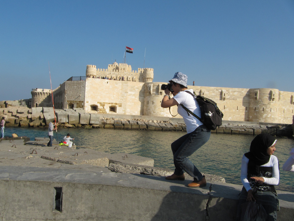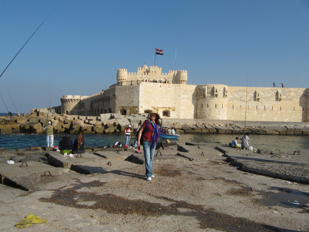 下午第一个行程是去开罗旁边的亚历山大市,参观亚历山大灯塔---灯塔遗址。灯塔遗址有世界七大奇迹之一的称谓。来到遗址远远望去,在海边有一座巨石建成的古堡延伸到海里,白色的石头在阳光下闪着耀眼的白光,这座古堡已有近2000年的历史,古堡上的灯塔因多次受到地震的影响而倒塌,只留下古堡。现在这里面已经开放成为旅游景点和当地人休闲望海的去处。