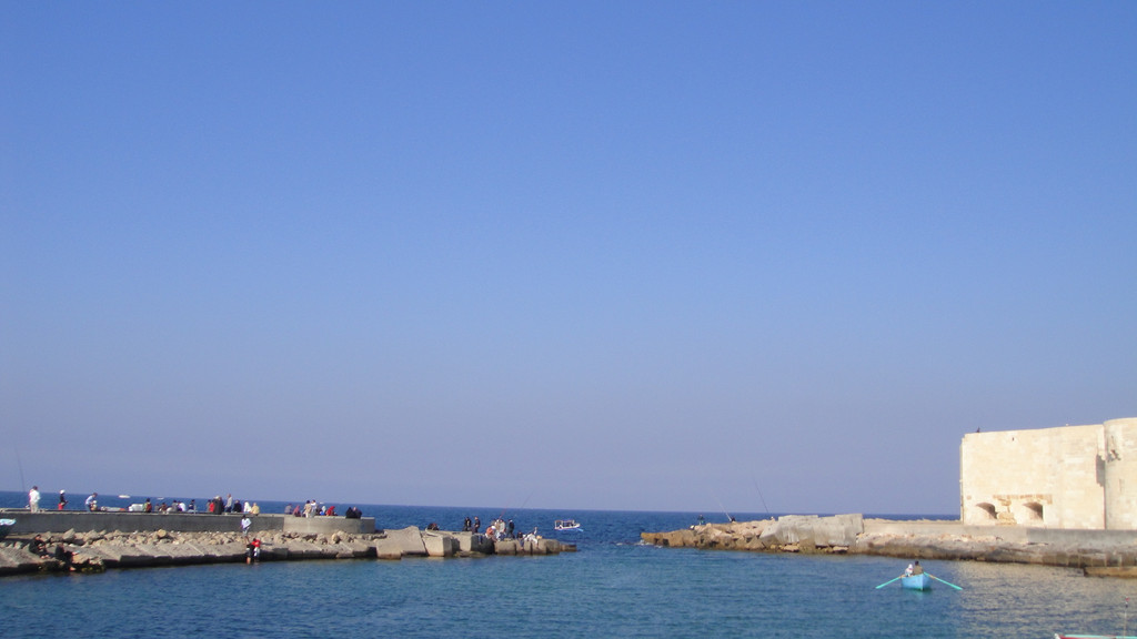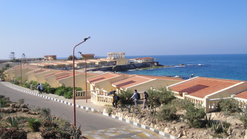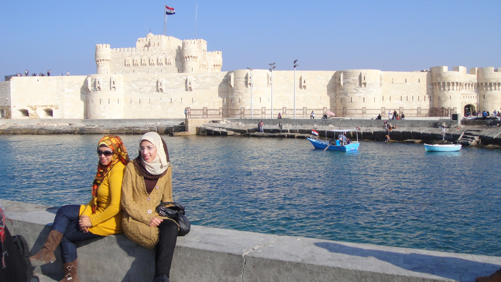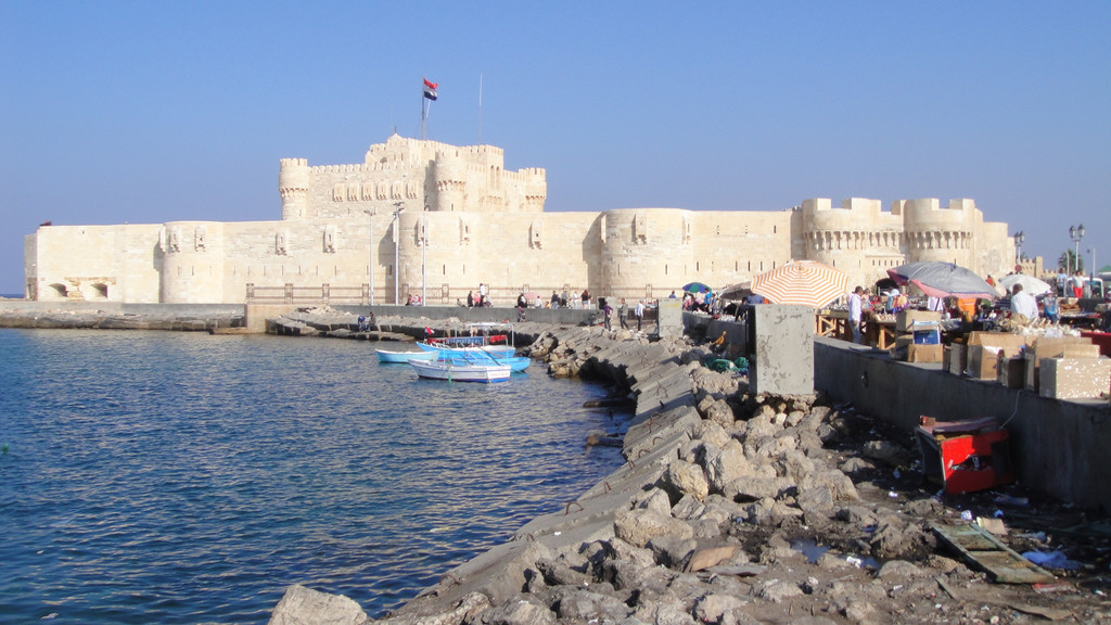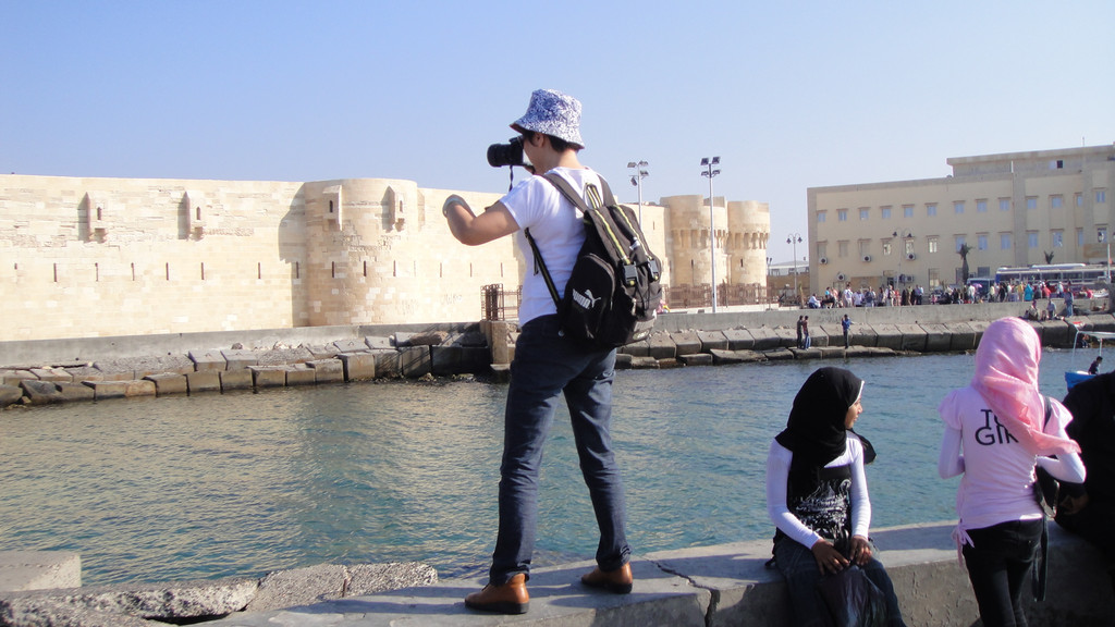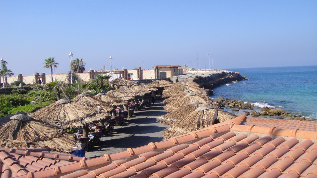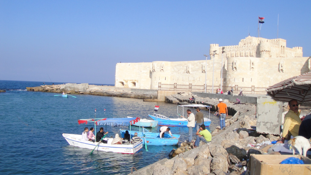 下午第一个行程是去开罗旁边的亚历山大市,参观亚历山大灯塔---灯塔遗址。灯塔遗址有世界七大奇迹之一的称谓。来到遗址远远望去,在海边有一座巨石建成的古堡延伸到海里,白色的石头在阳光下闪着耀眼的白光,这座古堡已有近2000年的历史,古堡上的灯塔因多次受到地震的影响而倒塌,只留下古堡。现在这里面已经开放成为旅游景点和当地人休闲望海的去处。