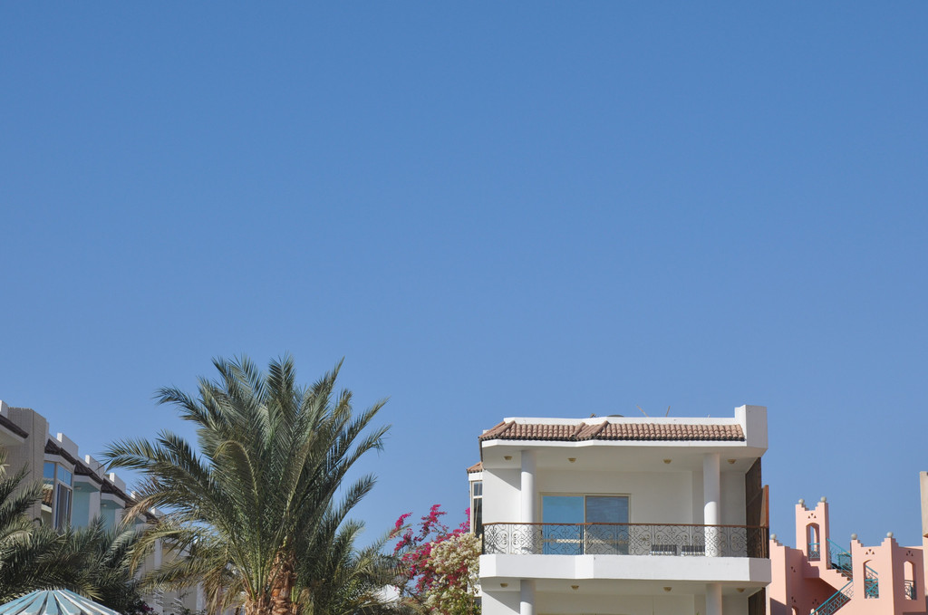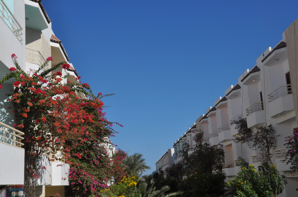 雪白的酒店和盛开的三角梅